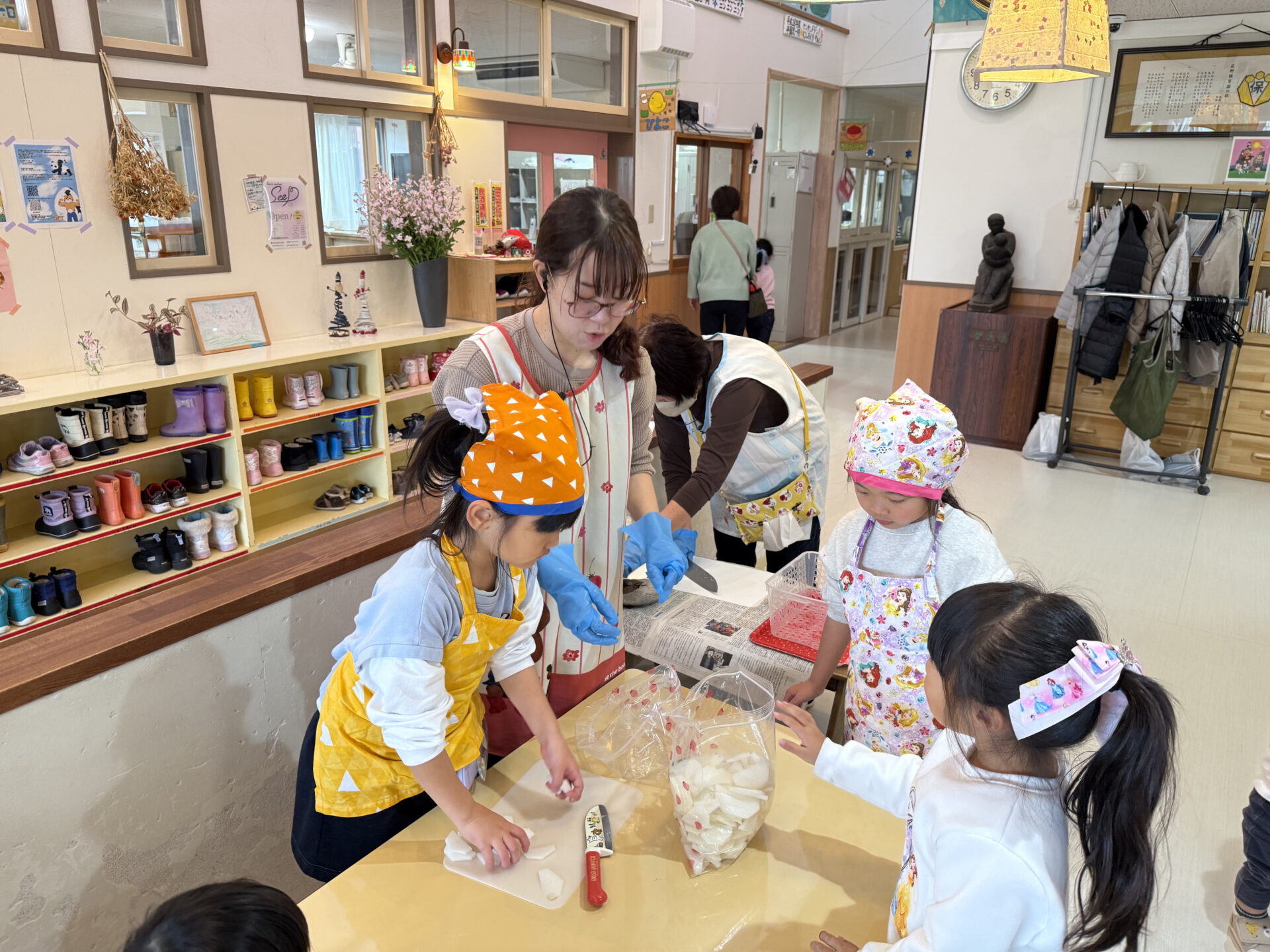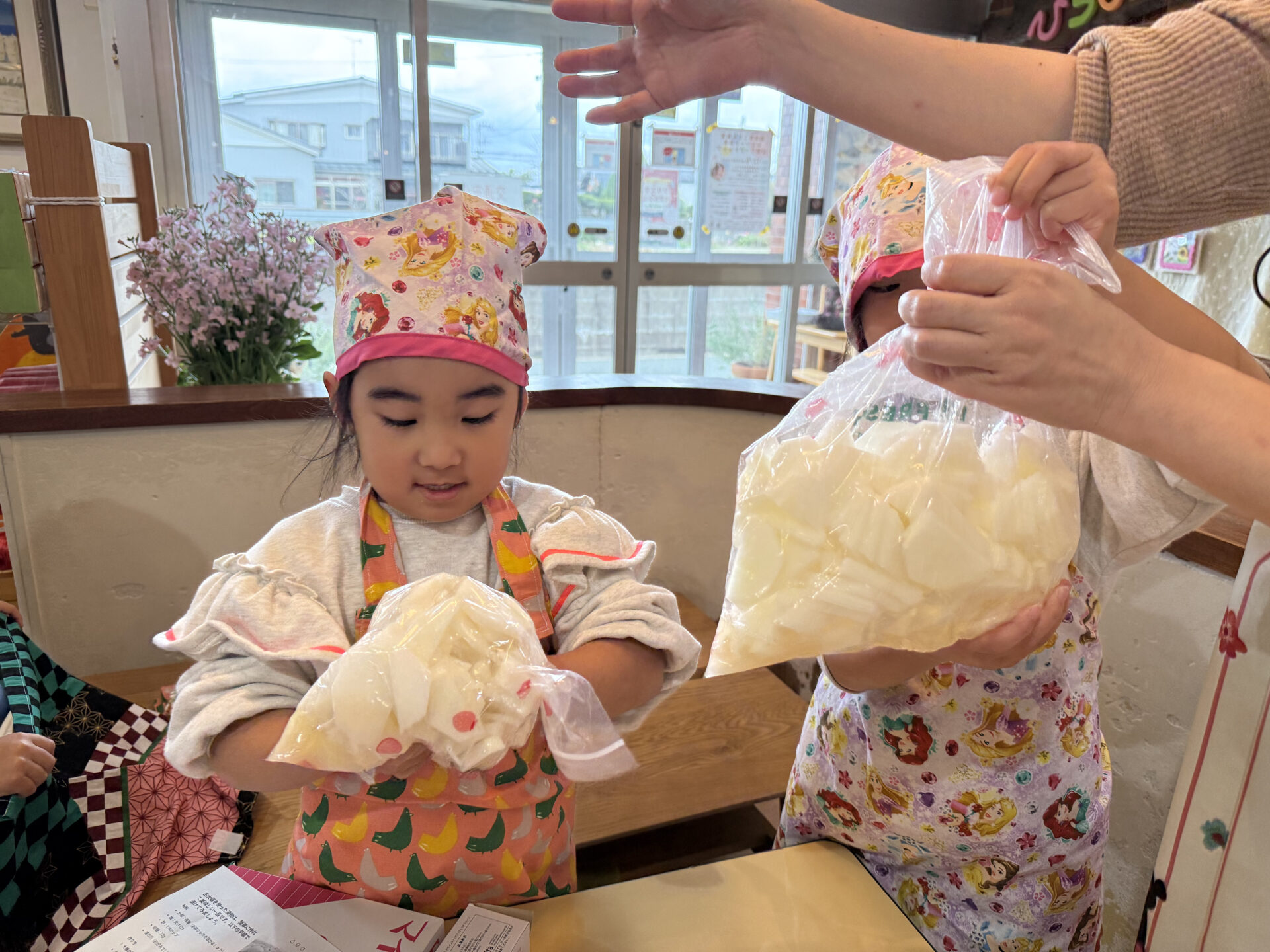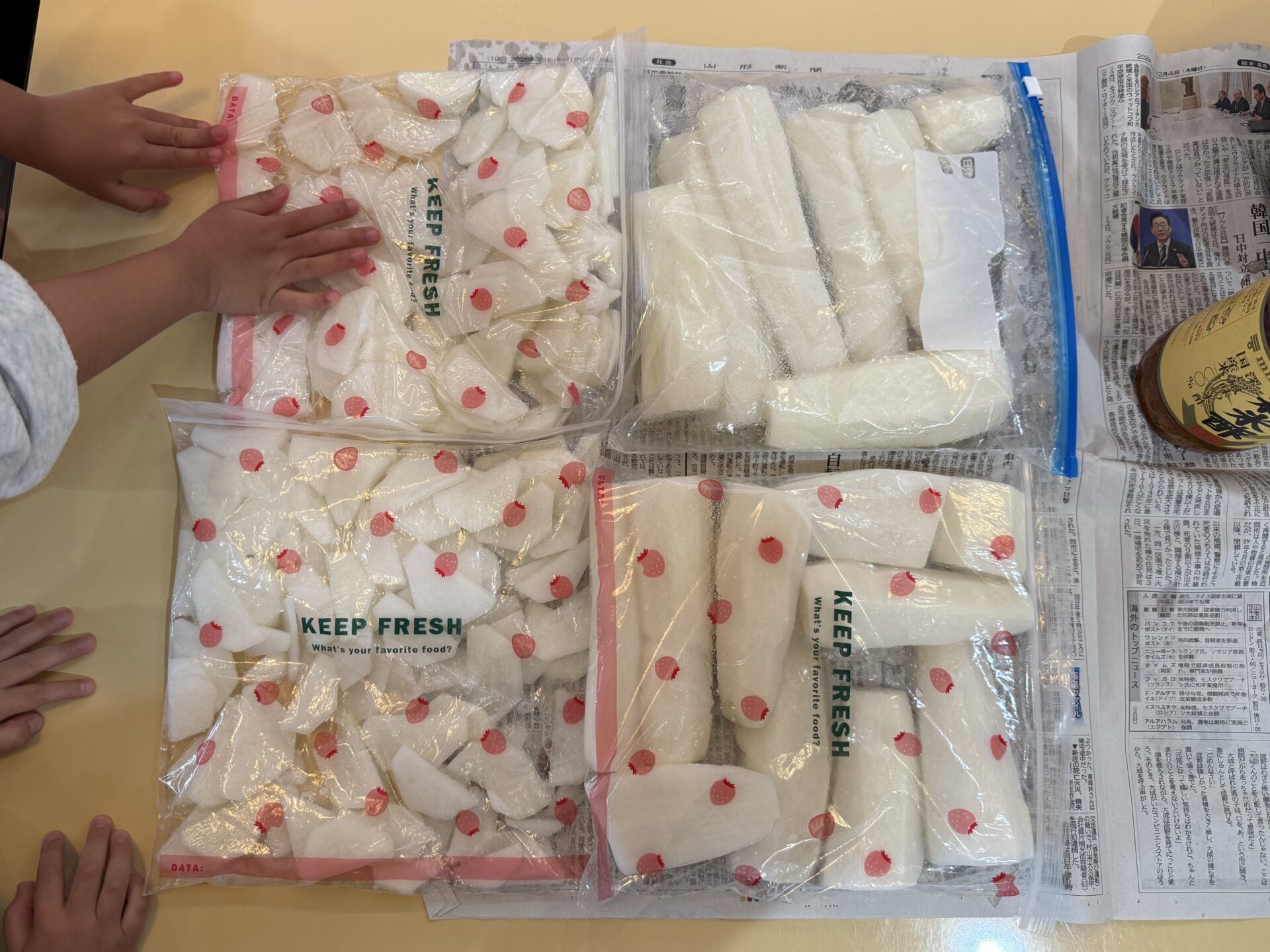 ①大根の皮をむいて縦半分に切り、さらに半月切りにしていきます。早速竹組のOちゃんがお手伝いに来てくれました!