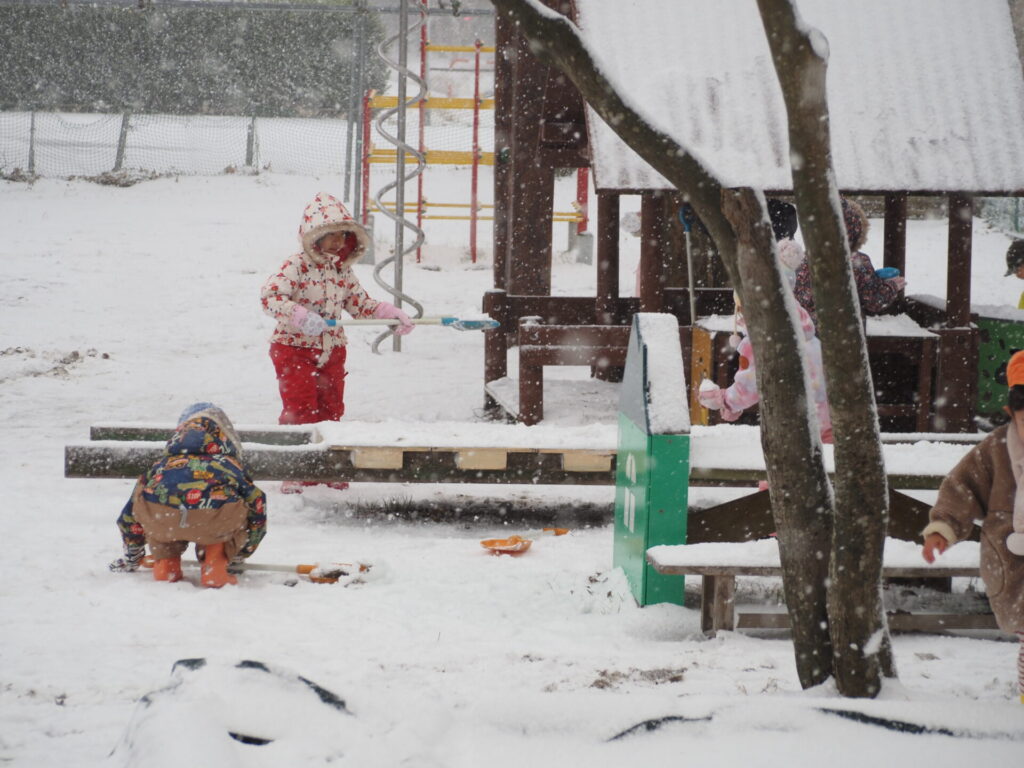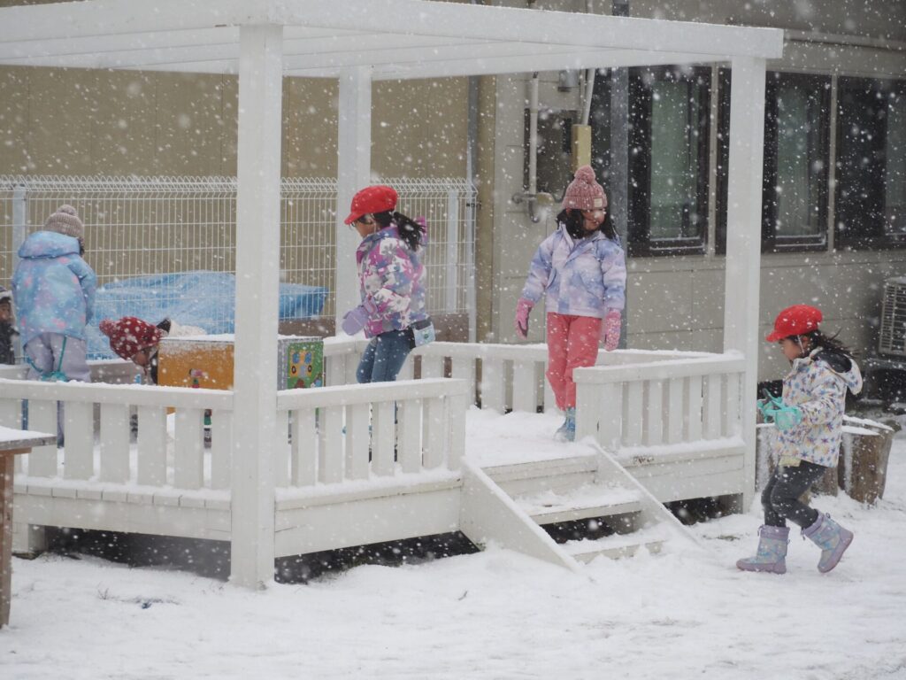 今日は、昨夜からの雪で園庭が真っ白になりました。