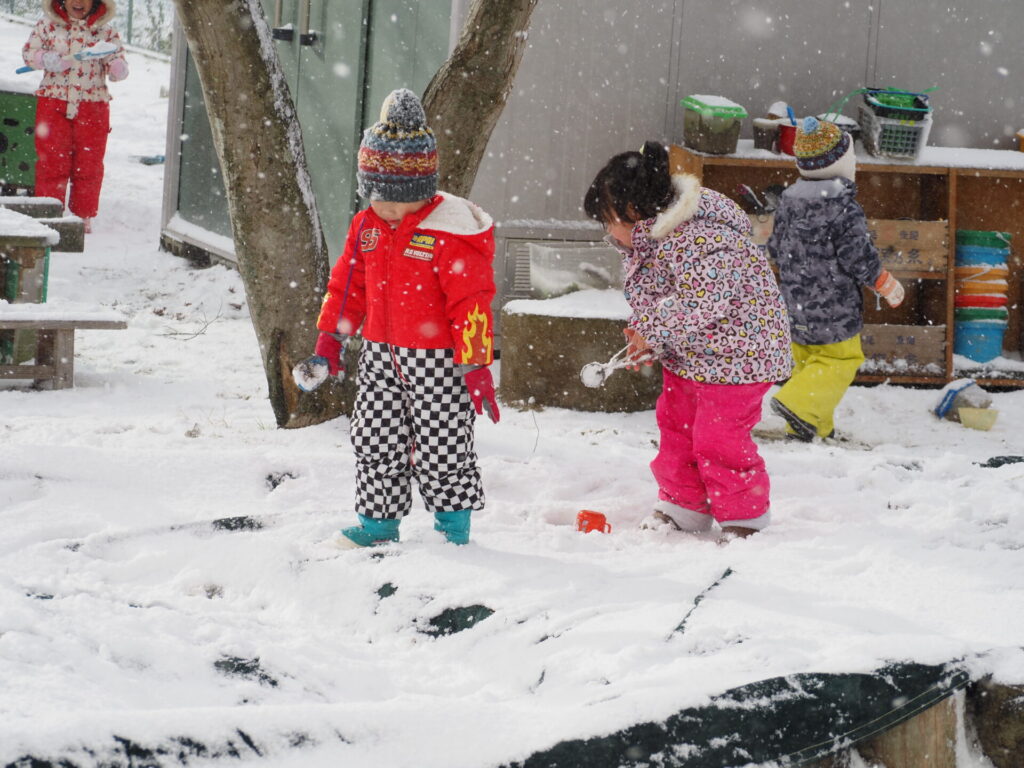 早く外で遊びたい子ども達は、12月の身体測定が終わると、待ちきれないようにジャンプスーツに身を包み、園庭に飛び出していきました