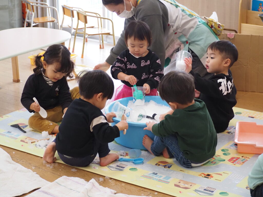 桃組さん達は、暖かい室内で冷たい雪を堪能していました😊