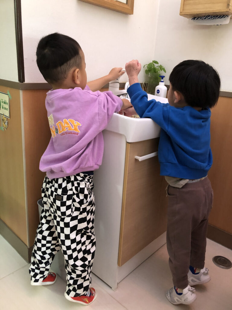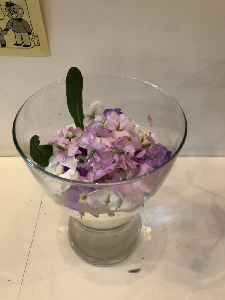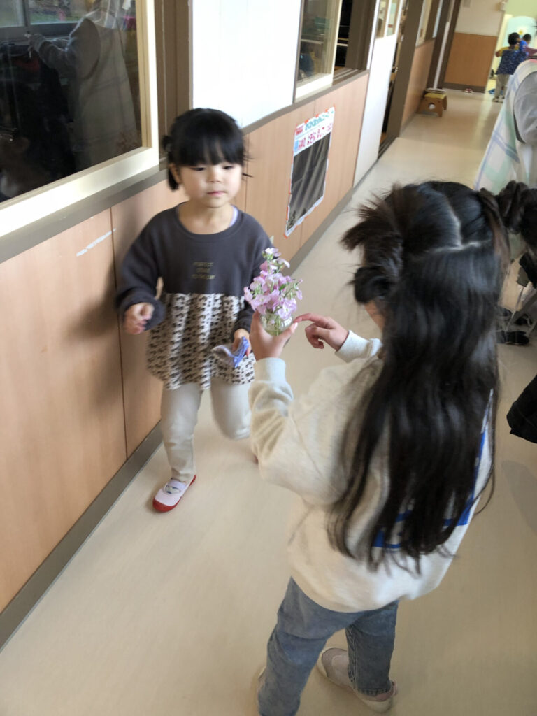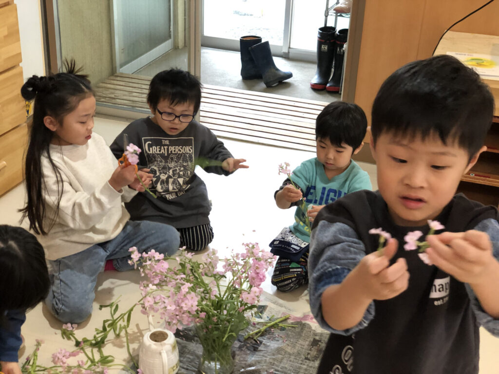 ストックの花をいただき、飾っていると「ぼくもやりたい」と来てくれた子ども達。