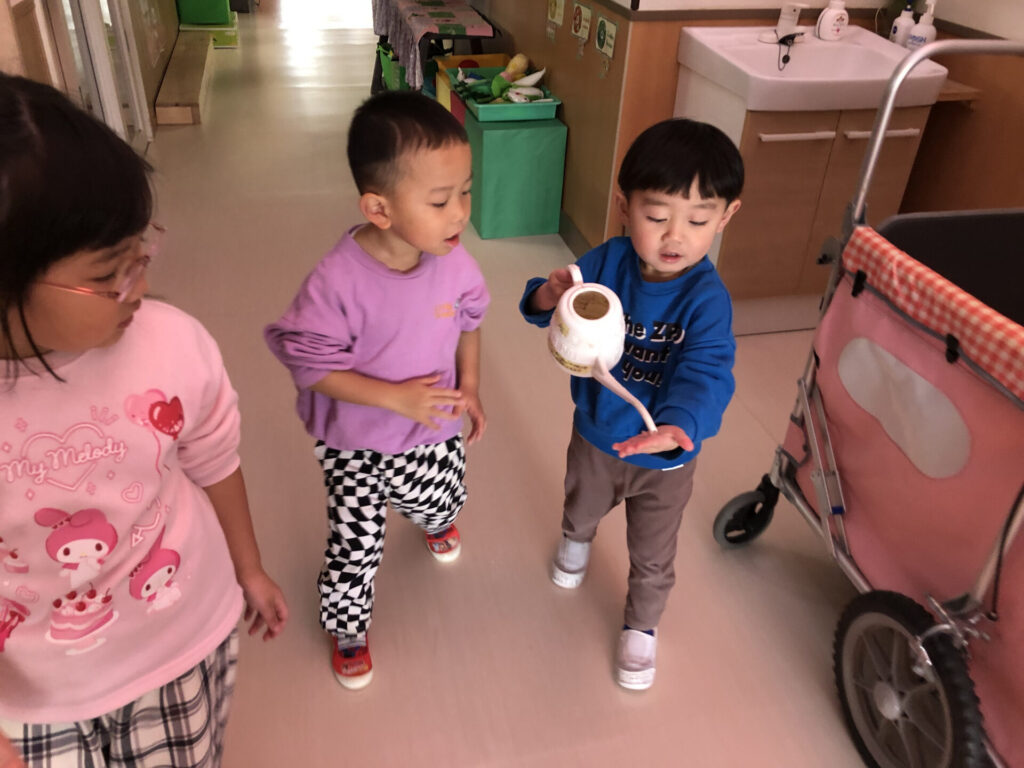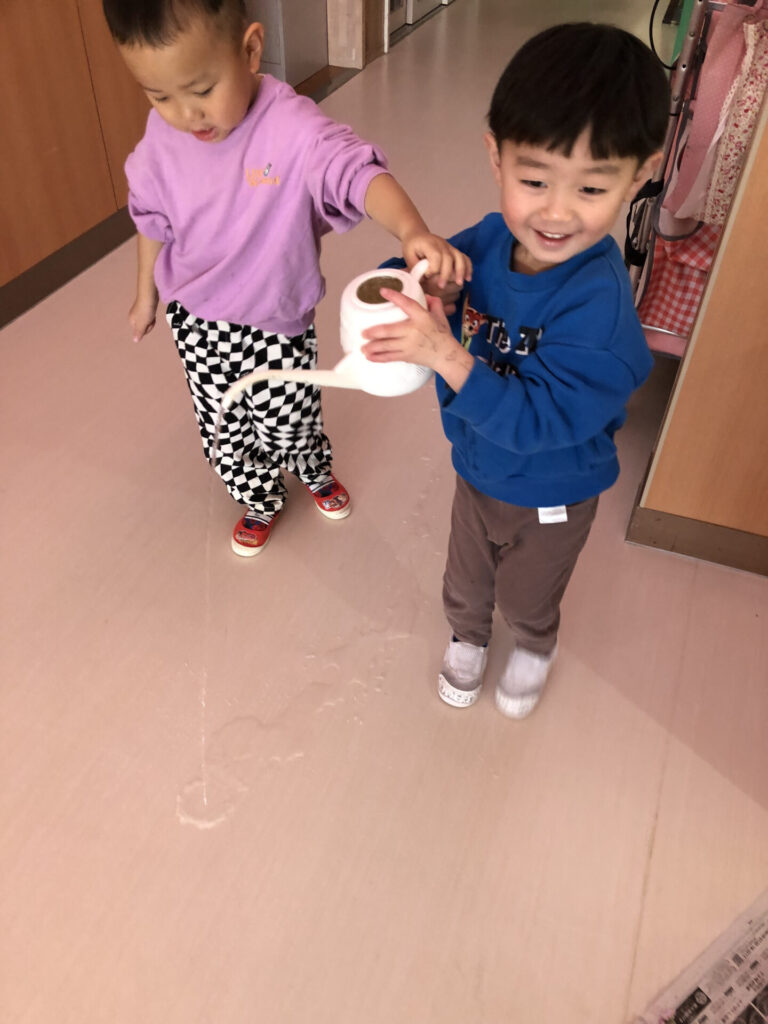 花瓶が大きかったのでジョーロに水を入れて花瓶に水を入れてくれました。こぼれても大丈夫!松組のお姉さんが拭いてくれます。どうやったらこぼれないのか、やってみて分かることもありますよね☺