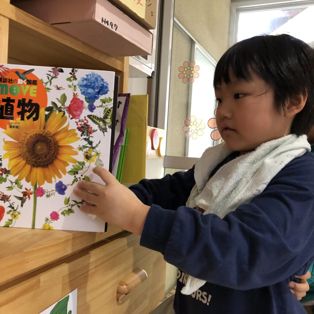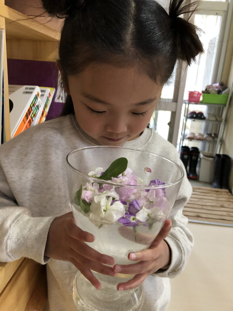 「この花はなんていうんだろう?」と図鑑を出して調べたり、少し枯れてきた花ももったいないからと自分達で切って飾りなおしてくれたりと、皆でワイワイ楽しいひととき。