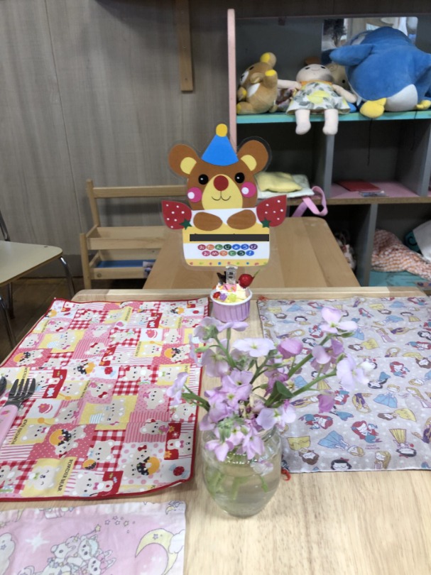 すると、竹組さんが「この花誕生日のNちゃんのテーブルに飾ろうよ!」とスマイルデーのNちゃんとお母さんが座る食卓にお花を飾ってくれました。
