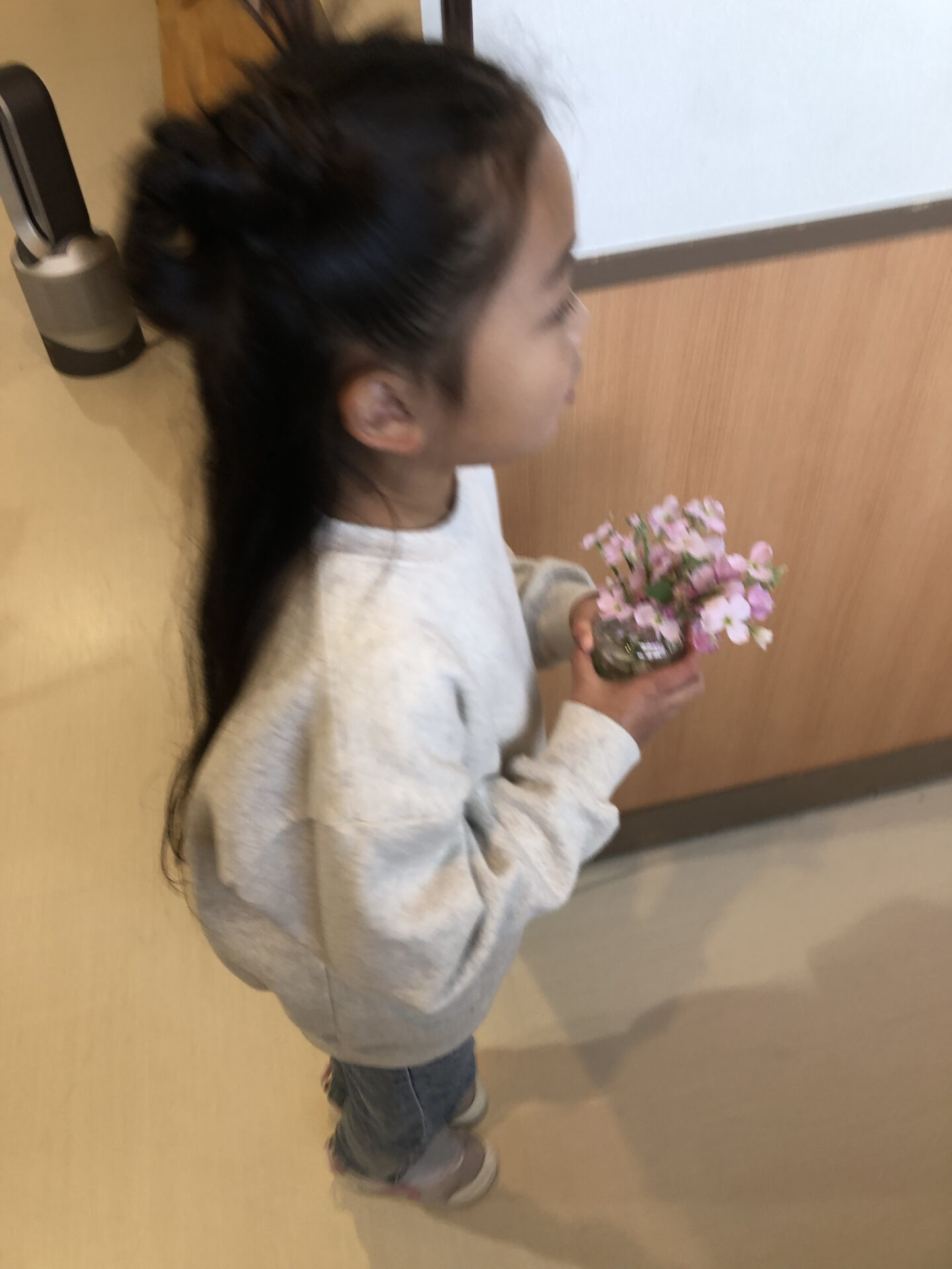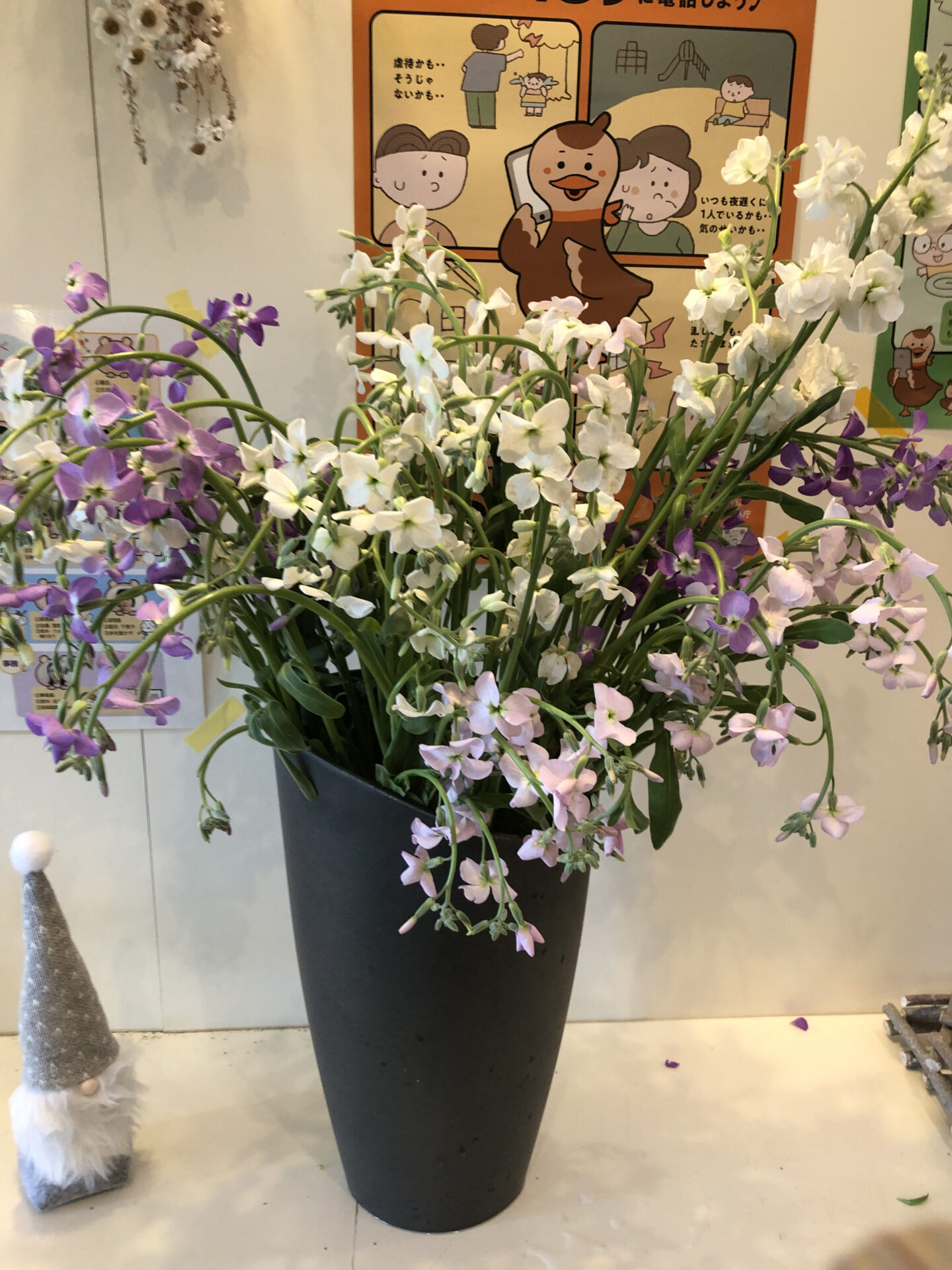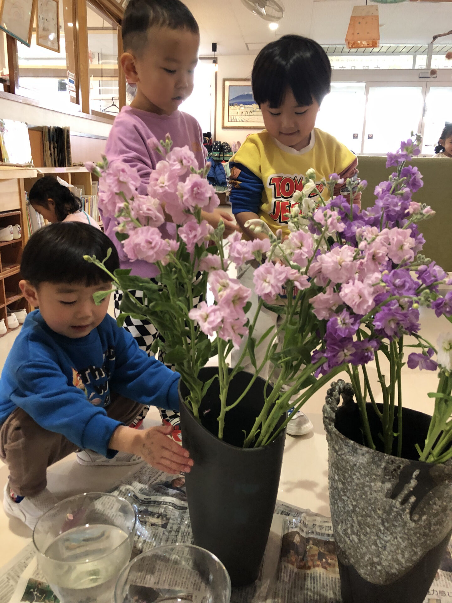 ストックの花をいただき、飾っていると「ぼくもやりたい」と来てくれた子ども達。