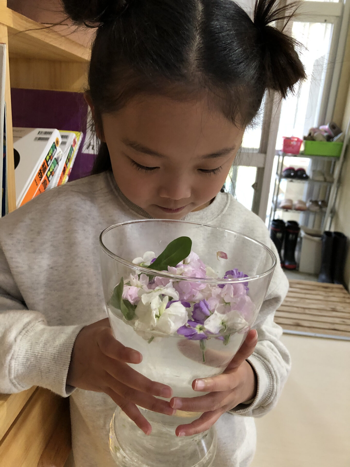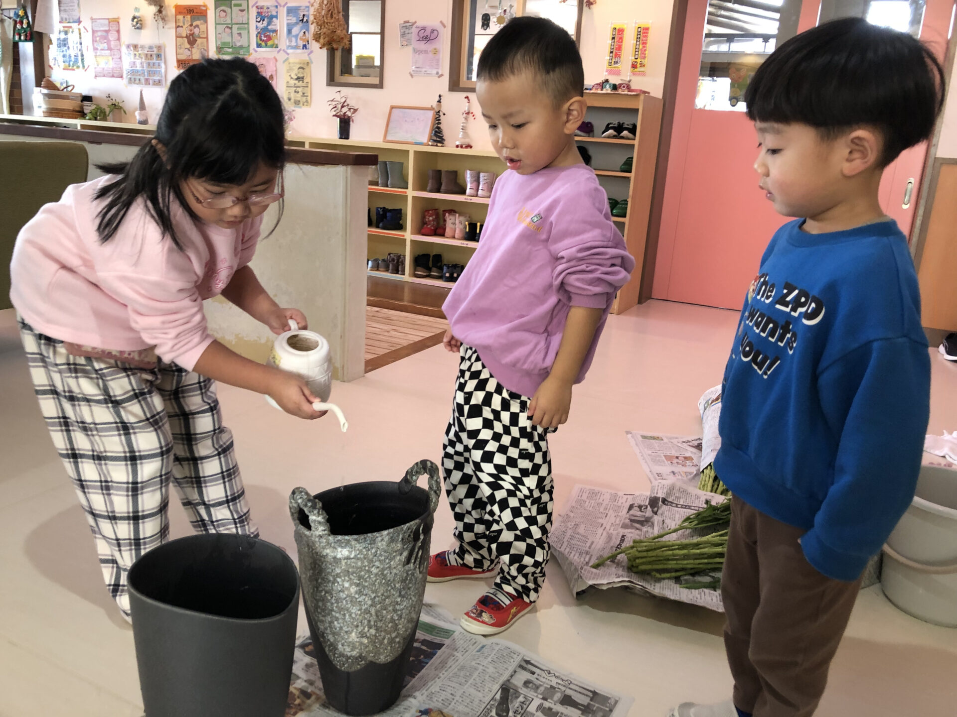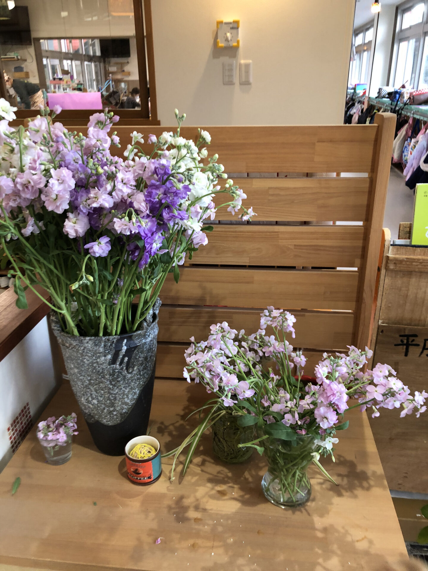 ストックの花をいただき、飾っていると「ぼくもやりたい」と来てくれた子ども達。