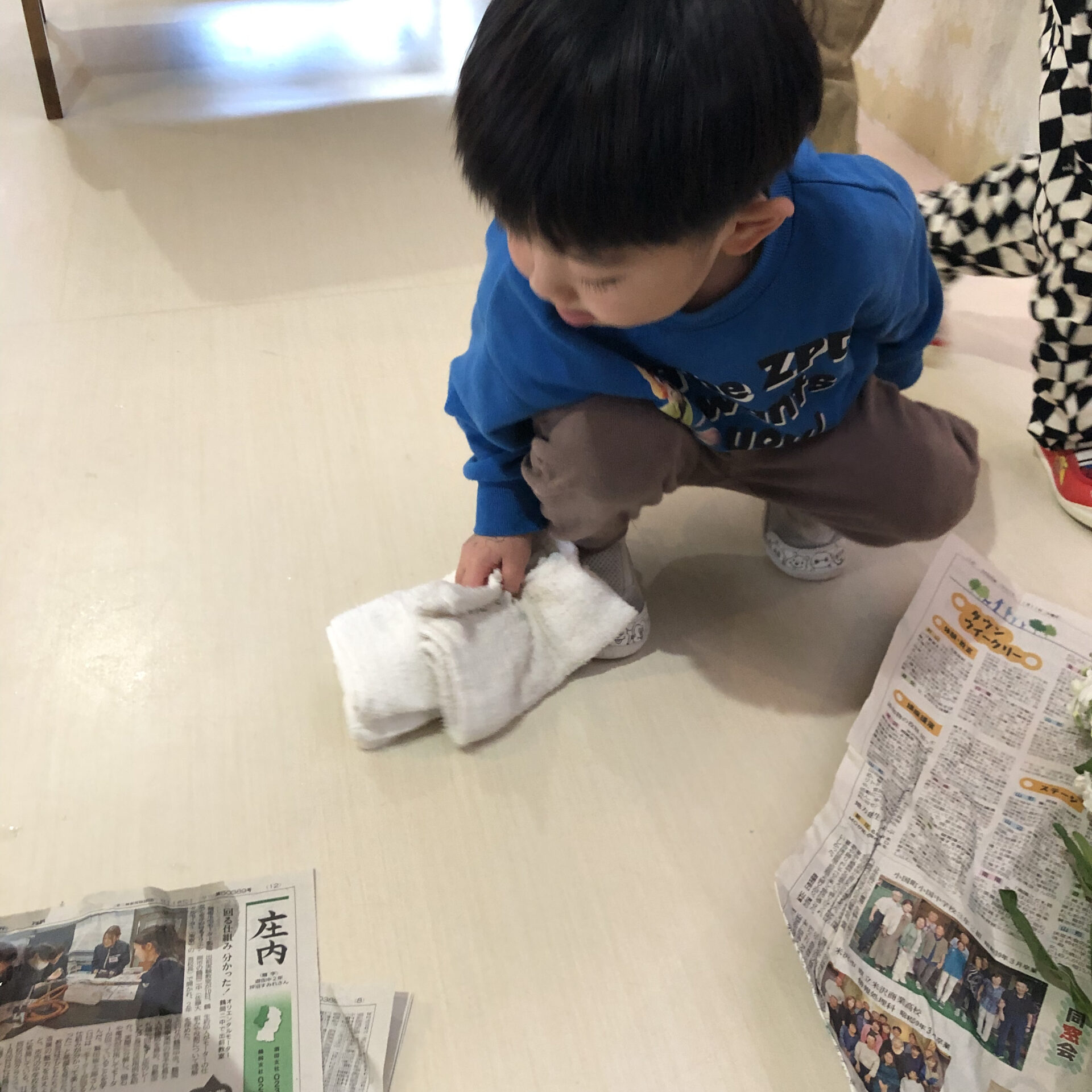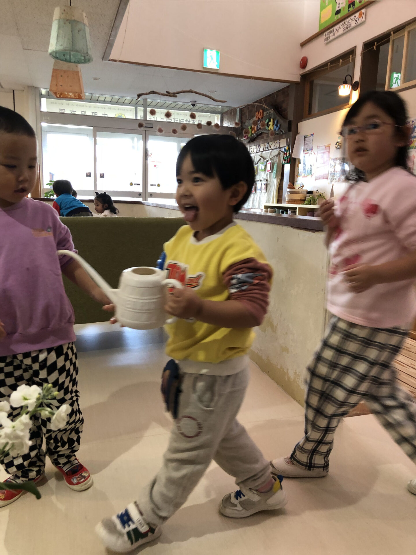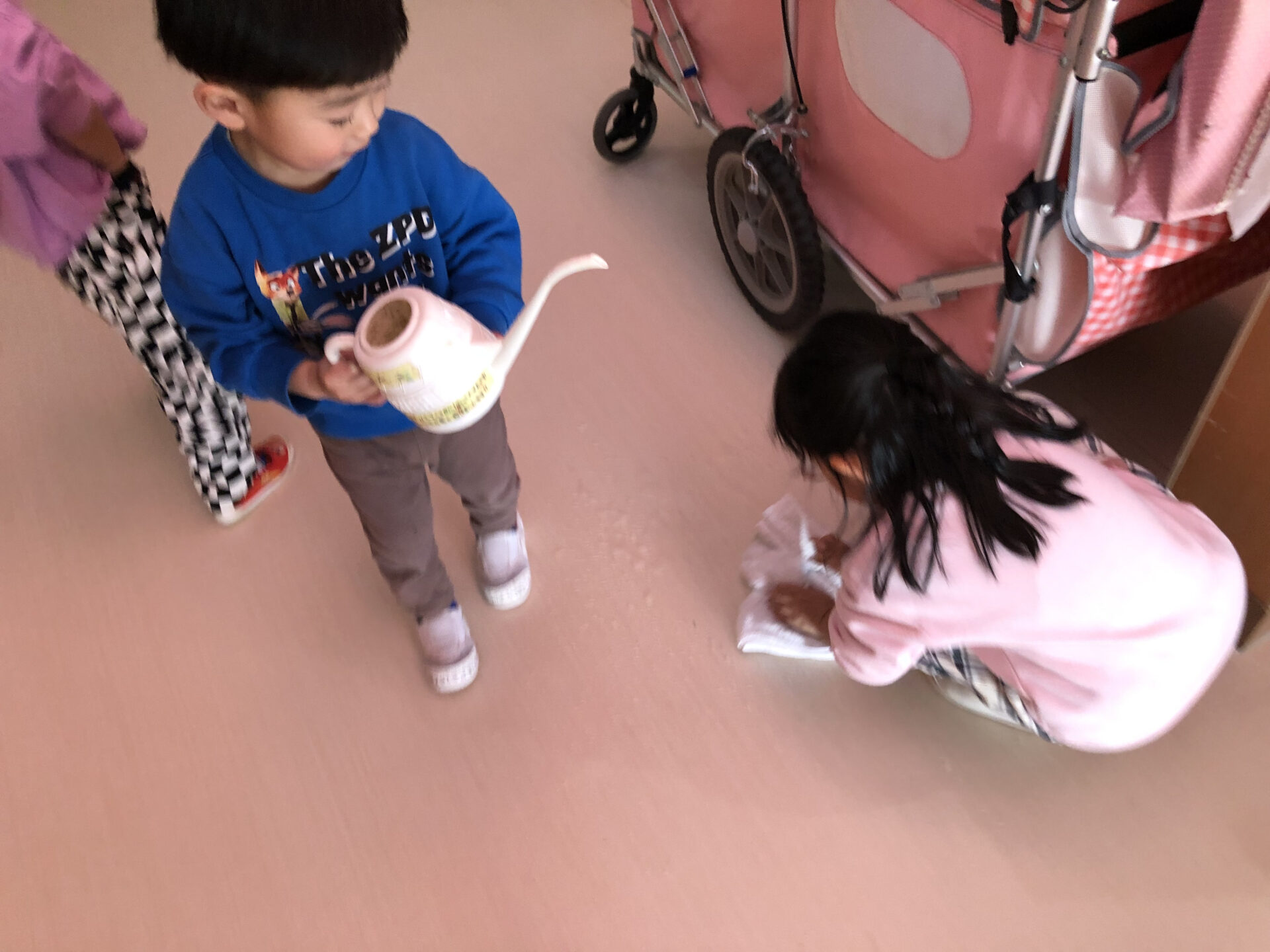 花瓶が大きかったのでジョーロに水を入れて花瓶に水を入れてくれました。こぼれても大丈夫!松組のお姉さんが拭いてくれます。どうやったらこぼれないのか、やってみて分かることもありますよね☺