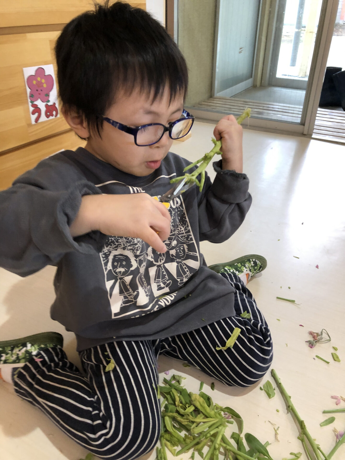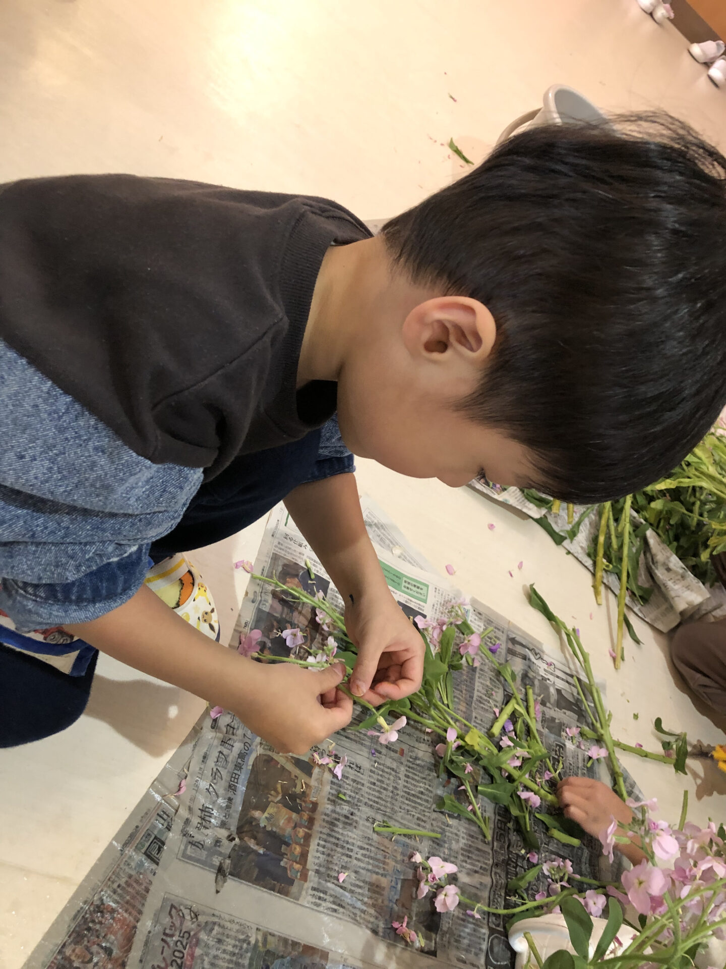 「この花はなんていうんだろう?」と図鑑を出して調べたり、少し枯れてきた花ももったいないからと自分達で切って飾りなおしてくれたりと、皆でワイワイ楽しいひととき。