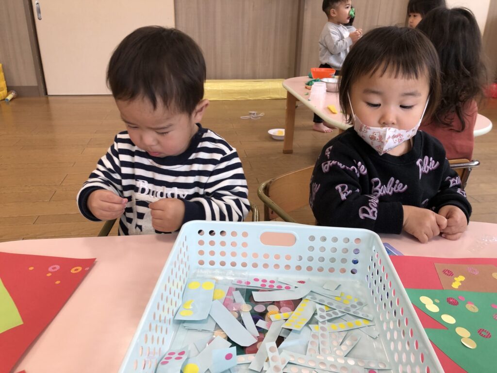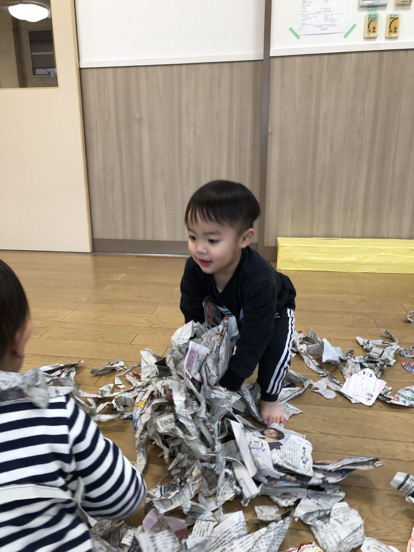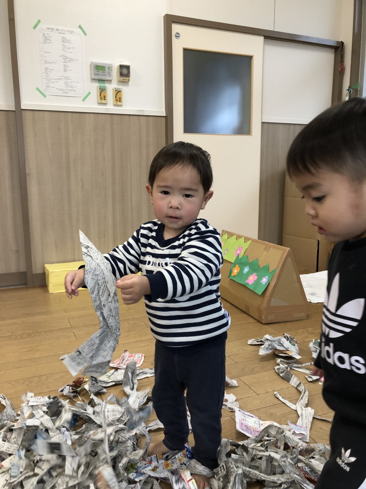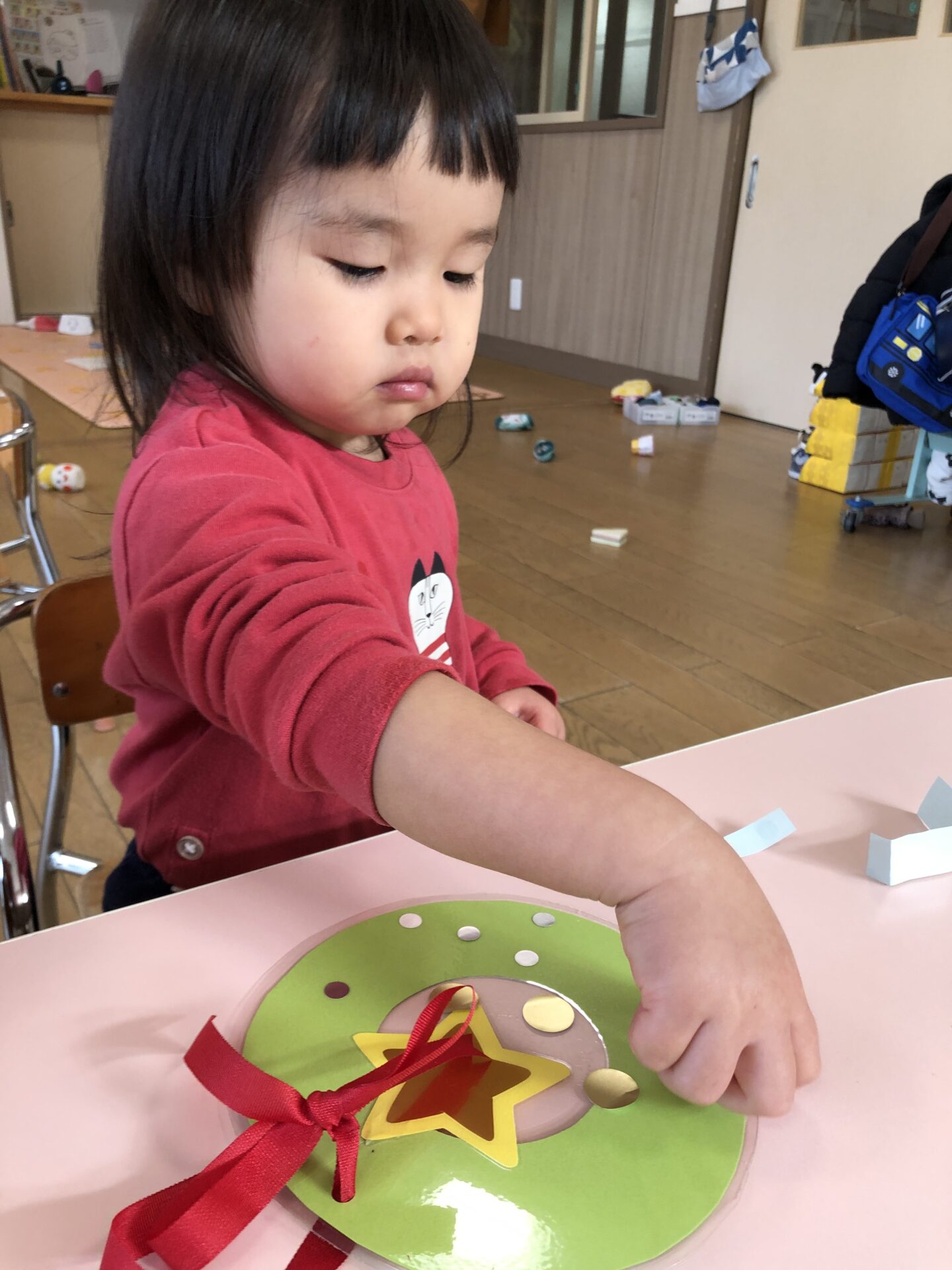指先を使った遊びをたくさん楽しんでいます☺ まずは小麦粉粘土遊び! たくさんこねたり、丸めたりお皿に入れたり、色を混ぜたりして遊んでいます♪ 新聞遊び☆ ビリビリ破いたり、新聞の中にごろんと寝転んだり、集めたりして楽しんでいます☆ シールを貼って、クリスマスのツリーやリースを製作中! 台紙からシールを上手にはがしてペタペタ貼って完成です☺ 指先を上手く使いながら、色々な遊びを楽しんでいます☺