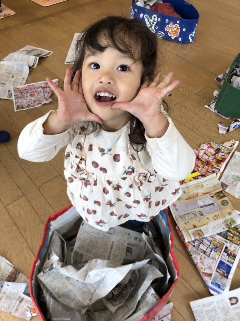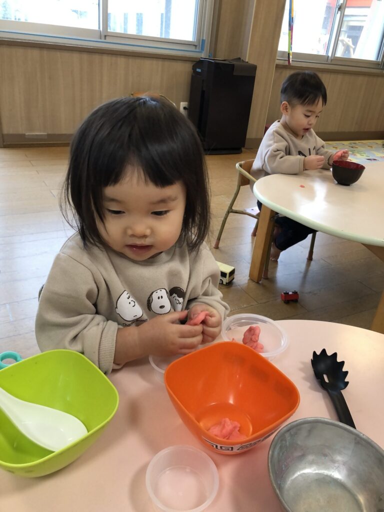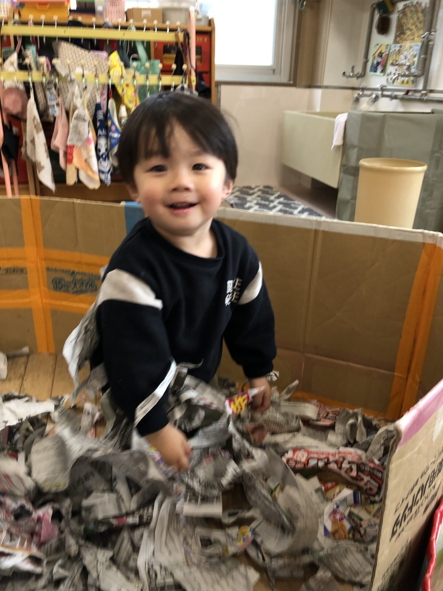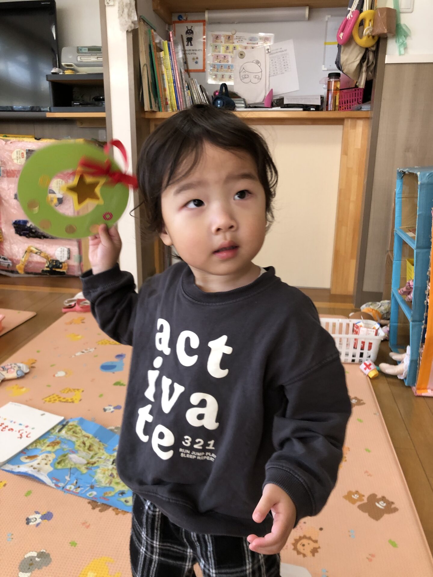 指先を使った遊びをたくさん楽しんでいます☺ まずは小麦粉粘土遊び! たくさんこねたり、丸めたりお皿に入れたり、色を混ぜたりして遊んでいます♪ 新聞遊び☆ ビリビリ破いたり、新聞の中にごろんと寝転んだり、集めたりして楽しんでいます☆ シールを貼って、クリスマスのツリーやリースを製作中! 台紙からシールを上手にはがしてペタペタ貼って完成です☺ 指先を上手く使いながら、色々な遊びを楽しんでいます☺
