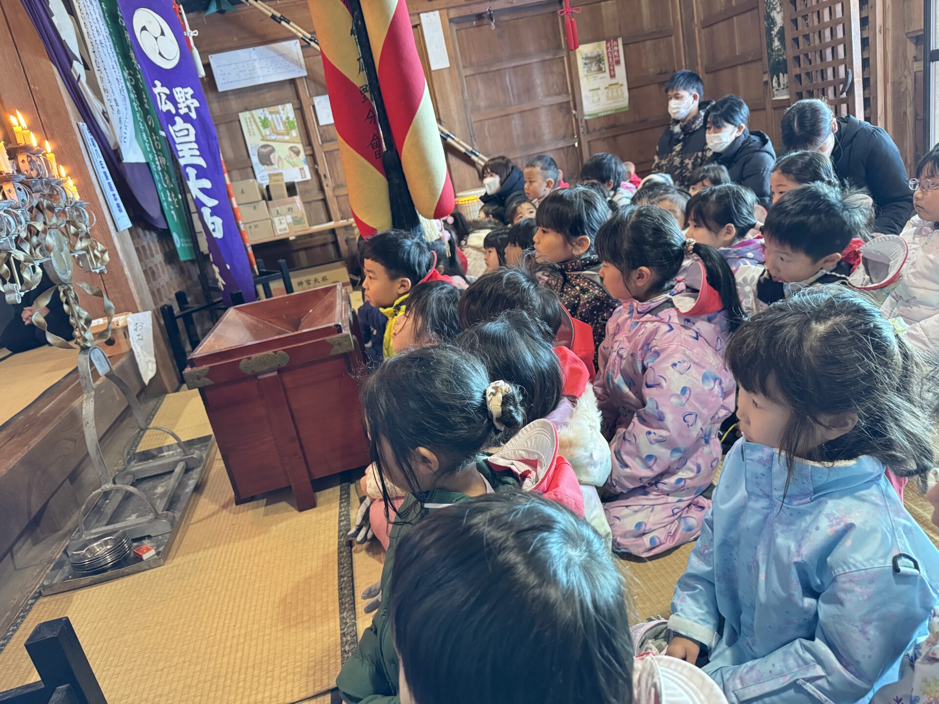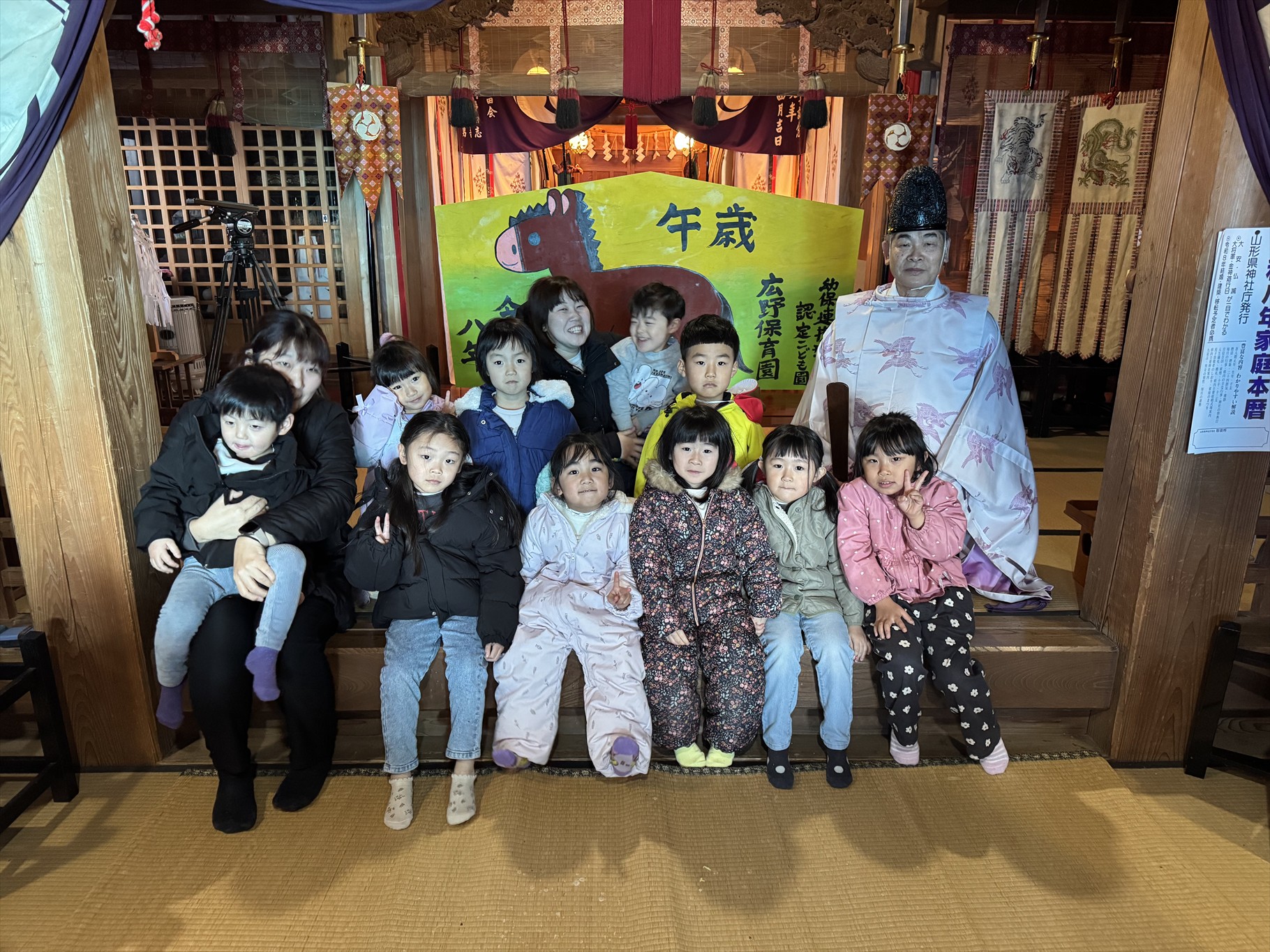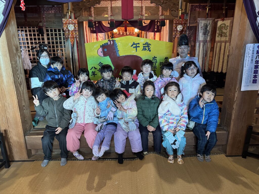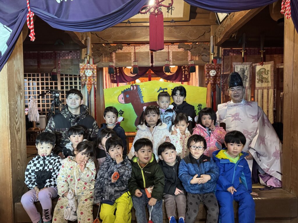 今日、松・竹・梅組さんは皇大神社に絵馬の奉納にいってきました😊松組さんが書いて塗ってくれた午🐎の絵馬を神社に祀り、神主さんから祈祷してもらいました!子ども達は真剣な表情で祈祷してもらっていました⭐今年も夏まつりに運動会、音楽発表会に、マルシェなどなど楽しいことがたくさんありました!!来年ももっともっと素敵な良い一年になりますように。最後に神主さんから、お神酒のかわりにジュースとお菓子をいただき、大喜びの子ども達でした!そして、おみくじも引かせていただきました。今日、おたよりばさみに入れて持ち帰りますので、ぜひお家で見て下さい😊