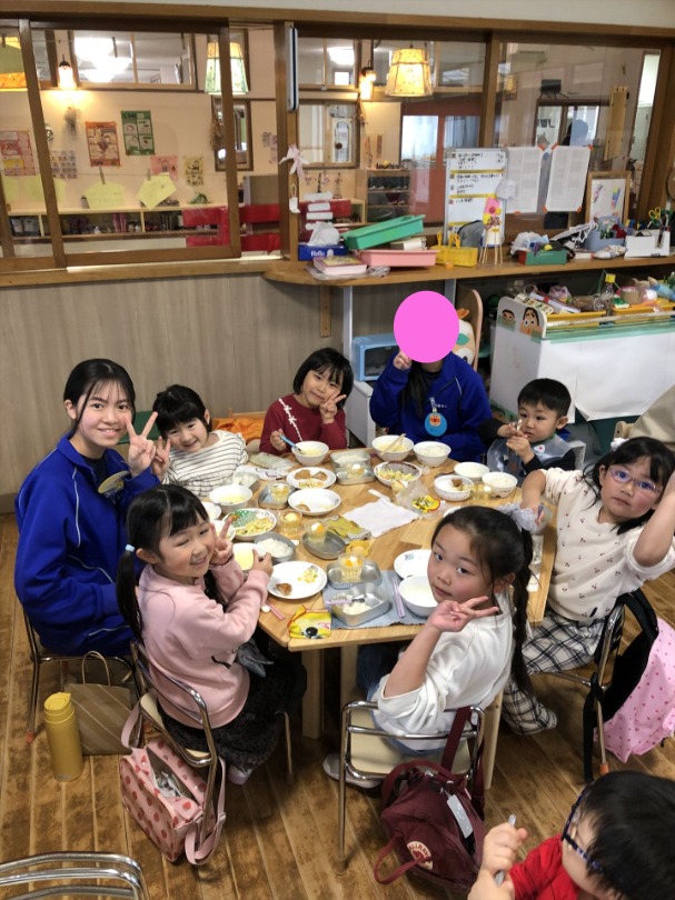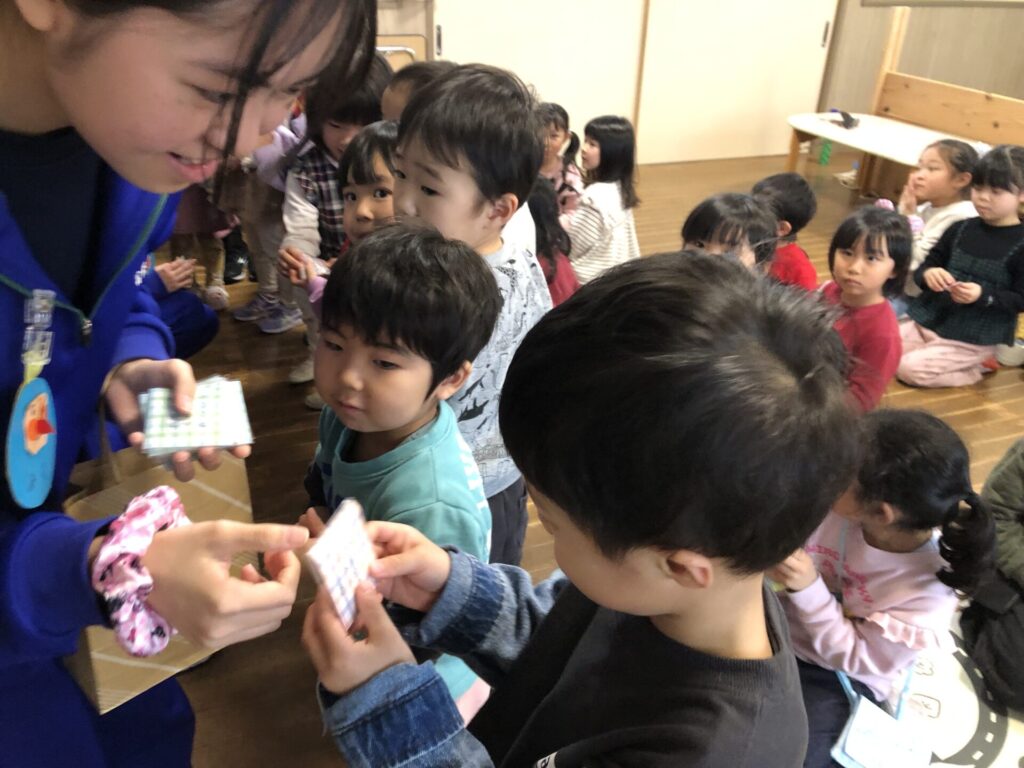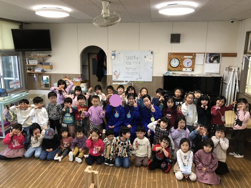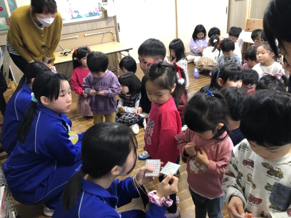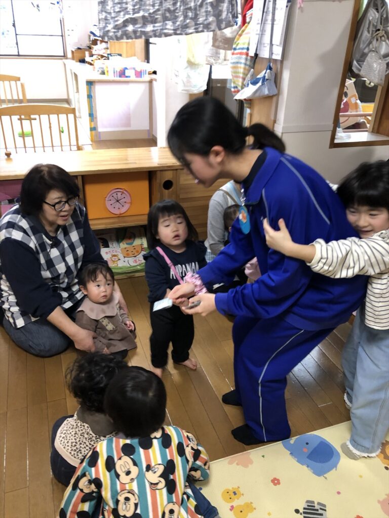 今日、3名の中学生のお姉さん達がボランティアに来てくれました😊🎵以前も来てくれたお姉さん達ということで、子ども達はすぐに仲良しになっていました!!手をつないで一緒に遊んだり、おんぶしてもらったり、一緒に給食を食べたりととっても嬉しそうな子ども達でした🌟そして、今日はクリスマス🎄お姉さん達から、手作りのサンタ🎅の折り紙とシールのプレゼントをいただきました💛🎅全部手作りで、メッセージも書いてくれました💌心の込もった温かいプレゼント🎁に子ども達とても喜んでいましたよ~😊お姉さん達、素敵なプレゼントと楽しい時間をありがとうございました!!また、ぜひ遊びに来てくださいね!!
