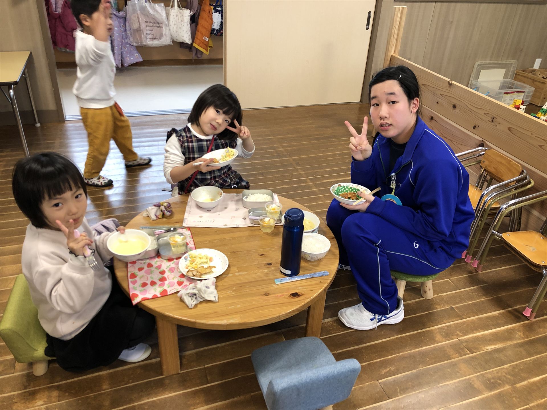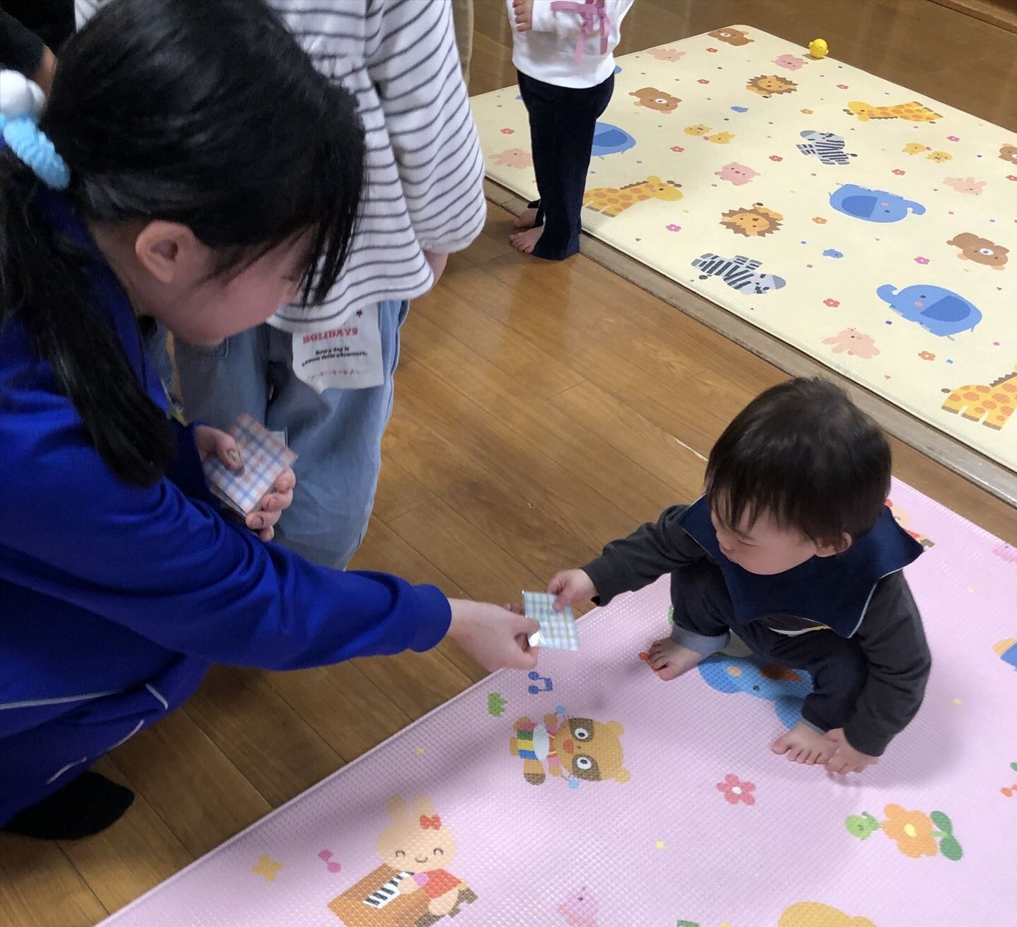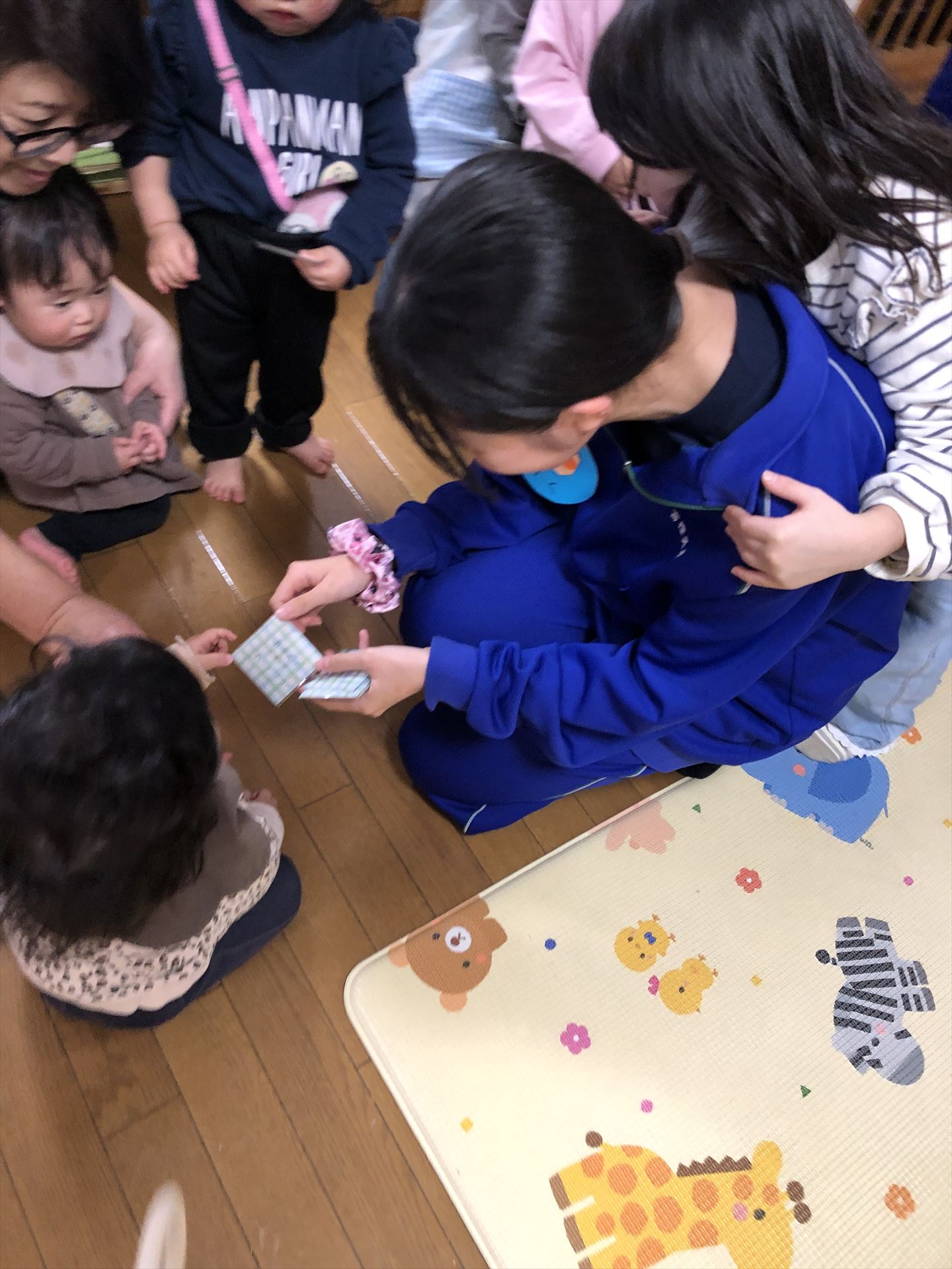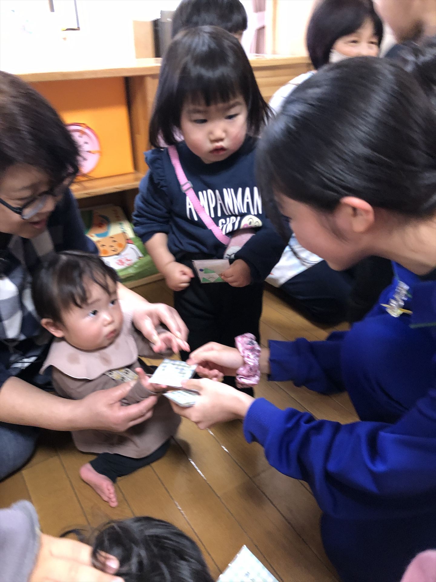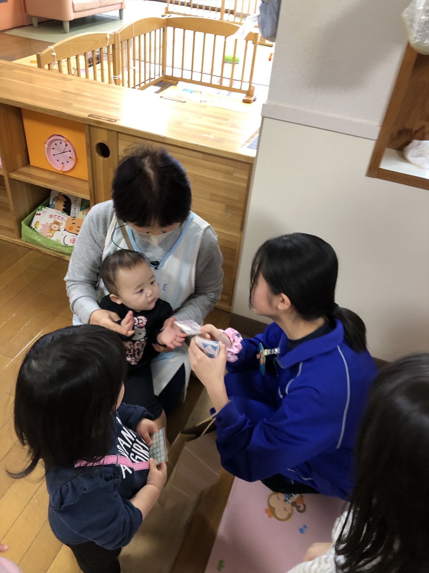 今日、3名の中学生のお姉さん達がボランティアに来てくれました😊🎵以前も来てくれたお姉さん達ということで、子ども達はすぐに仲良しになっていました!!手をつないで一緒に遊んだり、おんぶしてもらったり、一緒に給食を食べたりととっても嬉しそうな子ども達でした🌟そして、今日はクリスマス🎄お姉さん達から、手作りのサンタ🎅の折り紙とシールのプレゼントをいただきました💛🎅全部手作りで、メッセージも書いてくれました💌心の込もった温かいプレゼント🎁に子ども達とても喜んでいましたよ~😊お姉さん達、素敵なプレゼントと楽しい時間をありがとうございました!!また、ぜひ遊びに来てくださいね!!