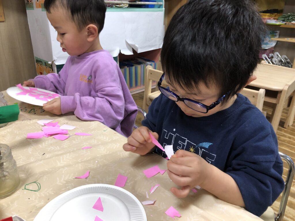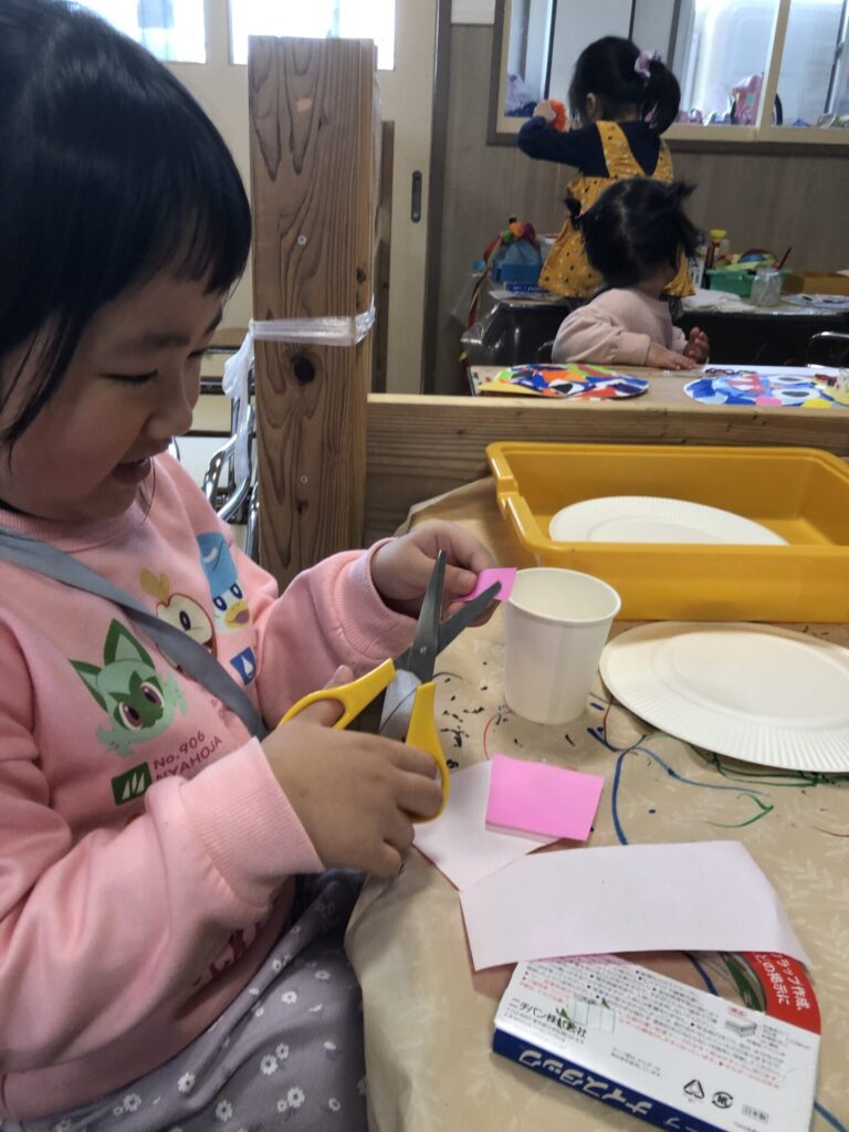 「青の鬼がいい」「カラフルな鬼にする!」と思い思いに好きな色を選び、ハサミを上手に細かく切り、紙皿に張り付けます。同じ場所に何枚も重ねて貼る子や、細かく丁寧に貼る子、お友達と相談して一緒の鬼を作る子など、それぞれオリジナルの鬼が出来上がっていきます。中には「強い鬼がいい!」と、ツノをたくさん作って貼っている子もいましたよ!