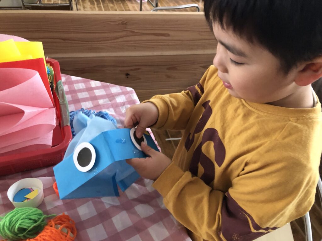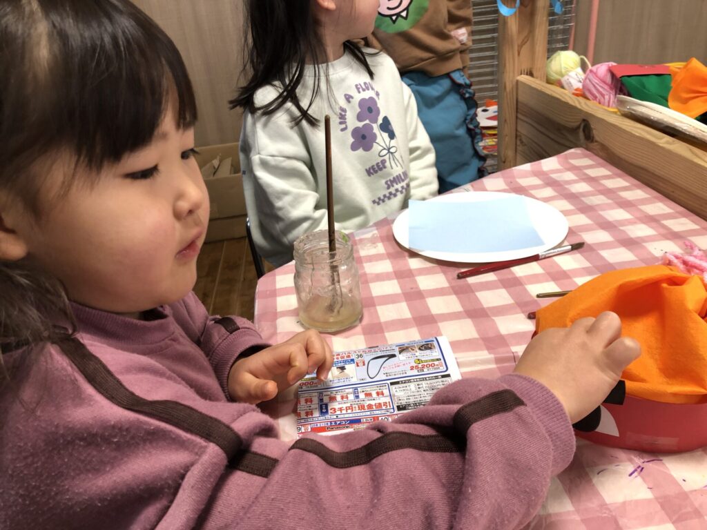 来月の節分に向けて、鬼のお面作りをしています。「鬼のお面作らないと、鬼来た時やっつけられない!」と子ども達同士話しをしている声も聞こえたりしながら、さっそく鬼の製作開始!