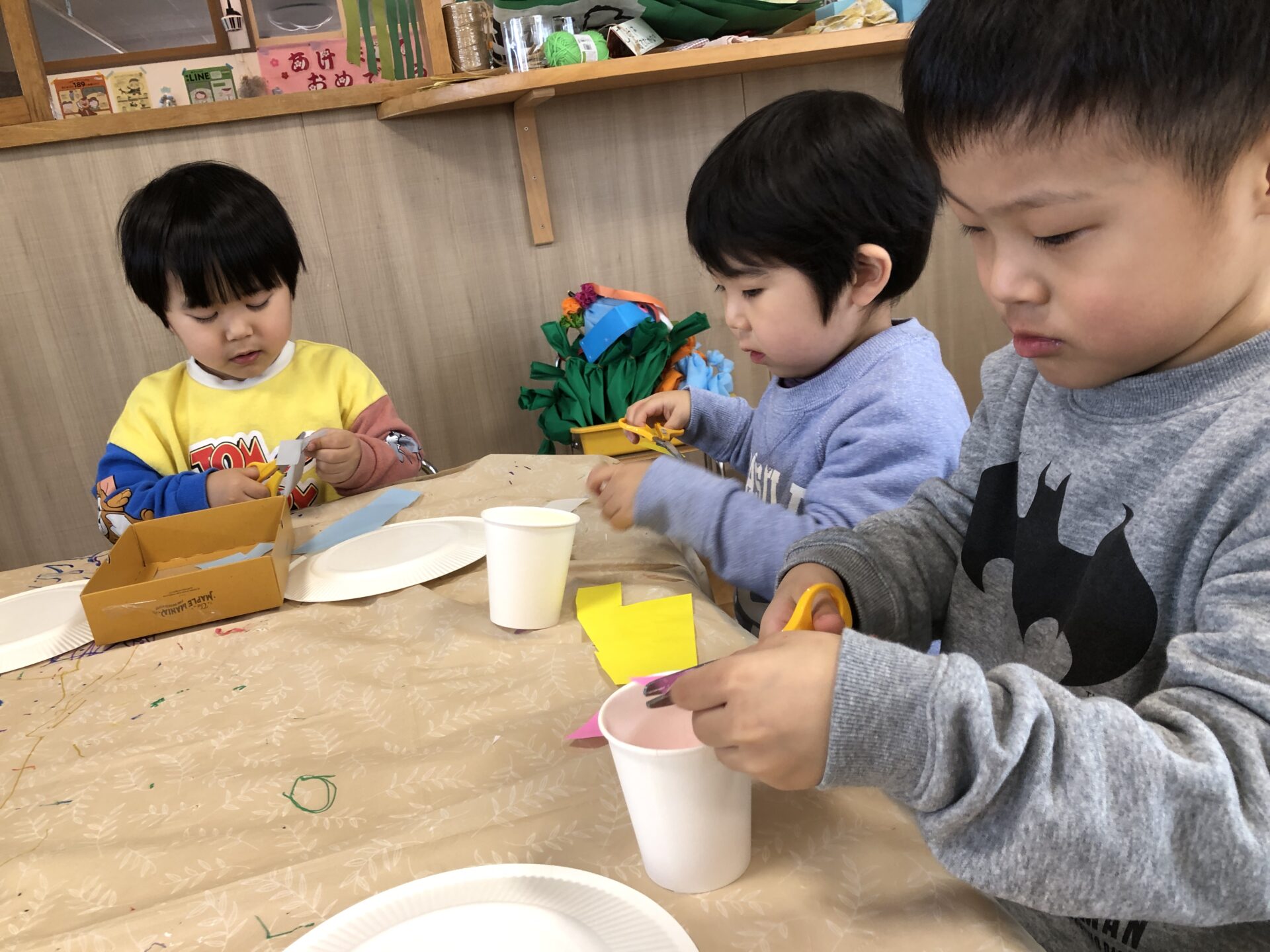 来月の節分に向けて、鬼のお面作りをしています。「鬼のお面作らないと、鬼来た時やっつけられない!」と子ども達同士話しをしている声も聞こえたりしながら、さっそく鬼の製作開始!
