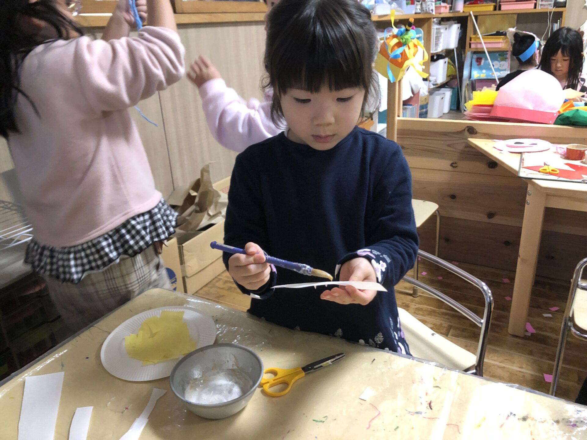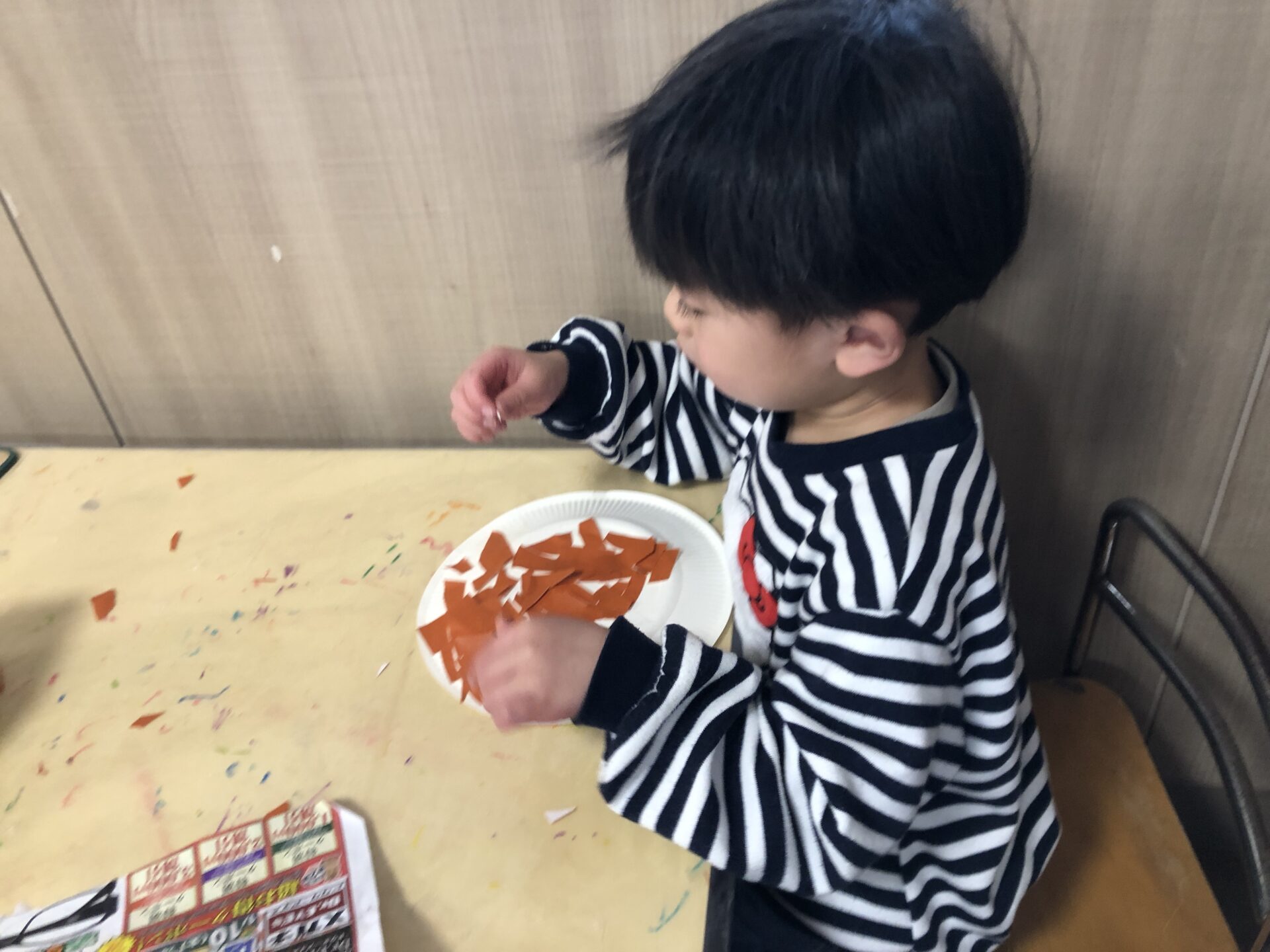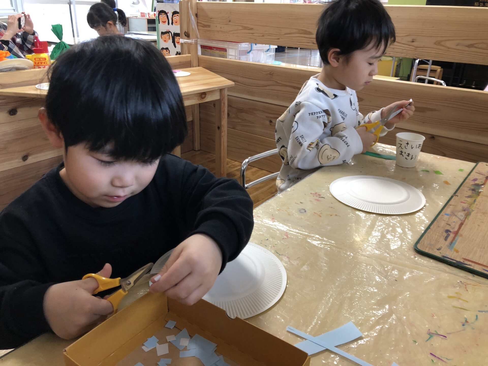 「青の鬼がいい」「カラフルな鬼にする!」と思い思いに好きな色を選び、ハサミを上手に細かく切り、紙皿に張り付けます。同じ場所に何枚も重ねて貼る子や、細かく丁寧に貼る子、お友達と相談して一緒の鬼を作る子など、それぞれオリジナルの鬼が出来上がっていきます。中には「強い鬼がいい!」と、ツノをたくさん作って貼っている子もいましたよ!