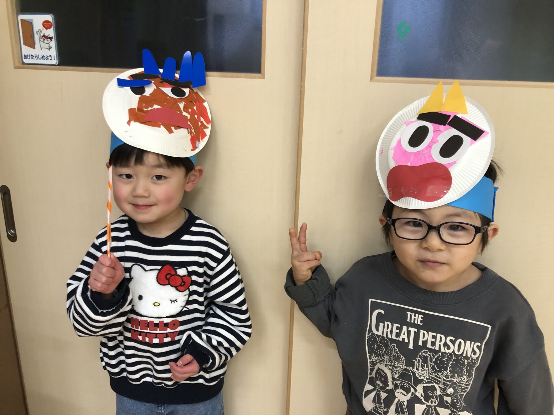 作ったお面を早くかぶりたくて、糊が乾くのを待ちきれず「糊、もう乾いた?」と何度も聞いてくる子も見られました。次の日、登園すると早速お面をチェックし、糊が乾いているのを確認すると、お面をかぶって鬼になりきり、園内を歩き回っている姿が見られましたよ。