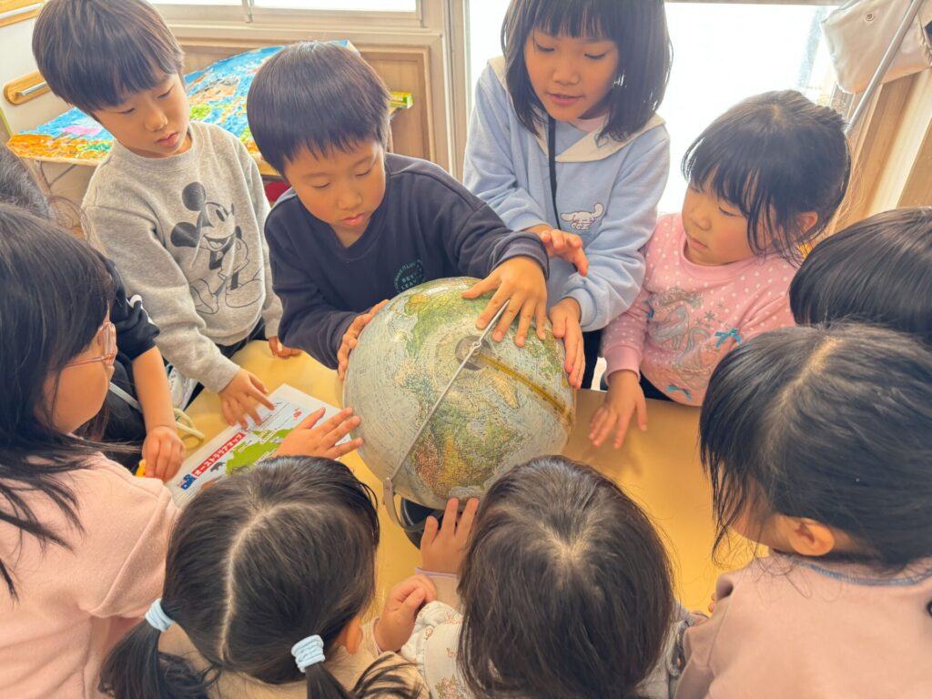 前日、オーストラリアと日本の違いや、オーストラリアってどこにあるの?という話を地球儀を使って松組さん達で話をしました。地球儀に興味津々の子ども達🌏日本とオーストラリアを見つけ、「日本小さいね!」「オーストラリアってこんなに大きい国なの!?」など、思い思いに話をしていました。