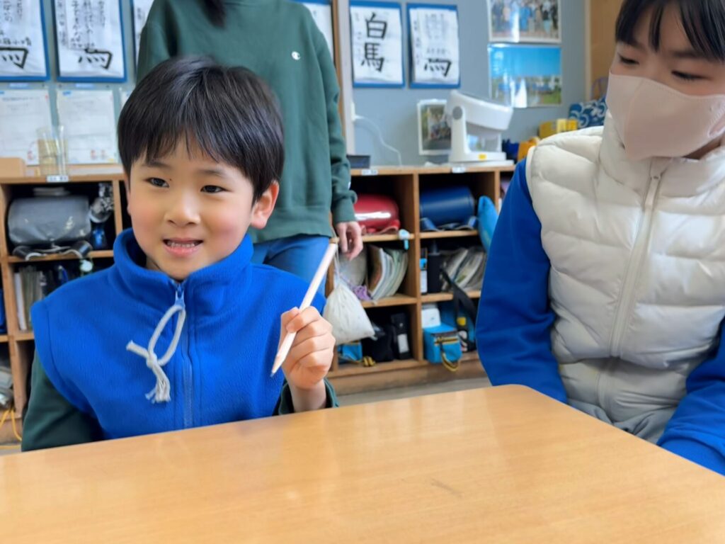 まず初めに5年生教室に移動して鉛筆で、線や自分の名前を書く活動をしました。