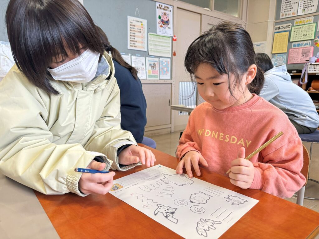 鉛筆の正しい持ち方を真剣に聞き、お兄さんお姉さんからも教えてもらいながらお話ししながら、楽しく書いていました📝「上手に書けてるね!」「自分の名前書けるのすごいね!」とたくさん褒めてもらえ、少し照れながらも嬉しそうにしていました😳
