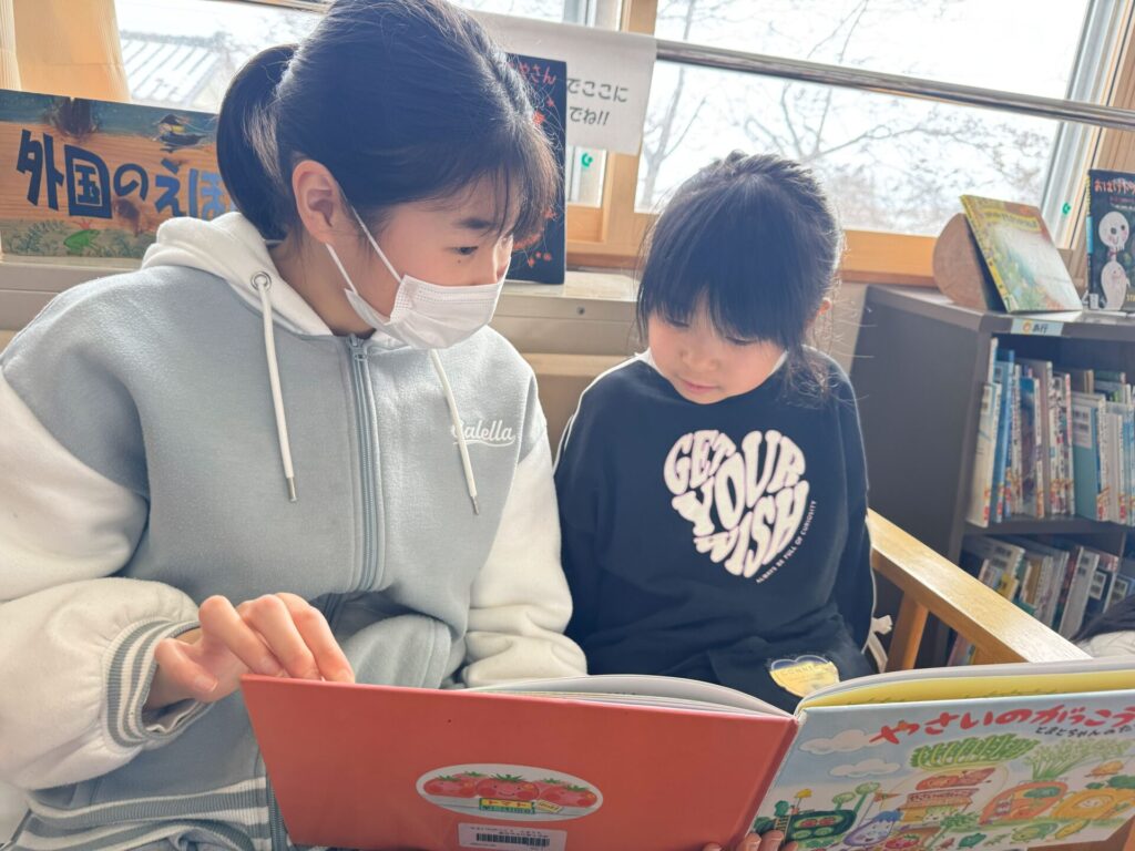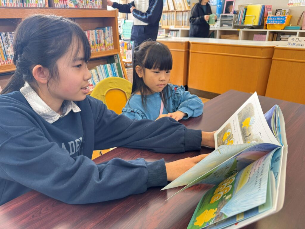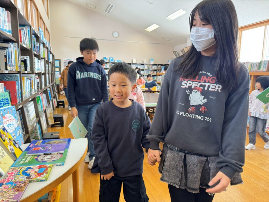 図書室に移動し、読み聞かせもしてもらいました。本がたくさんある学校の図書室に驚く子ども達。お兄さんお姉さんが松組さんに選んでくれた絵本だけでなく、子ども達が好きな絵本を選んで読んでもらう姿もありました📖
