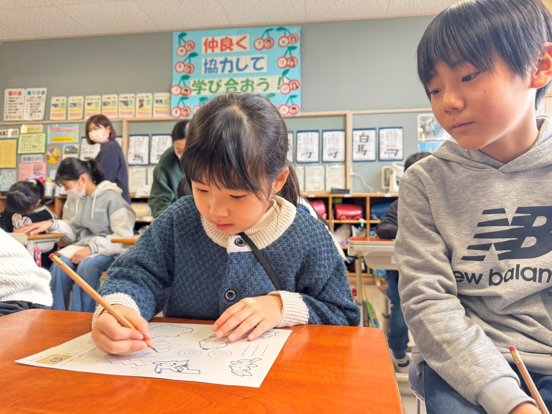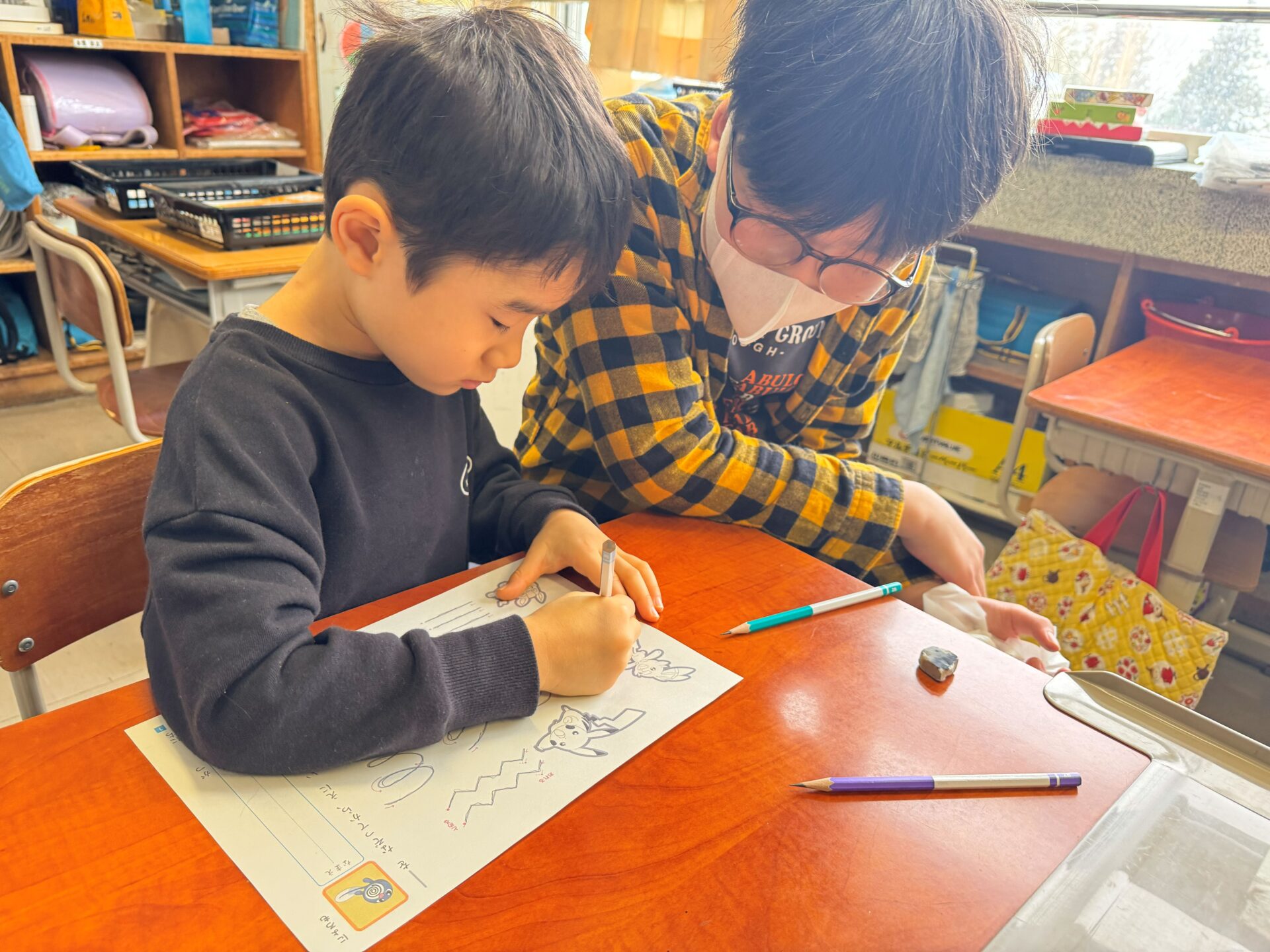 鉛筆の正しい持ち方を真剣に聞き、お兄さんお姉さんからも教えてもらいながらお話ししながら、楽しく書いていました📝「上手に書けてるね!」「自分の名前書けるのすごいね!」とたくさん褒めてもらえ、少し照れながらも嬉しそうにしていました😳