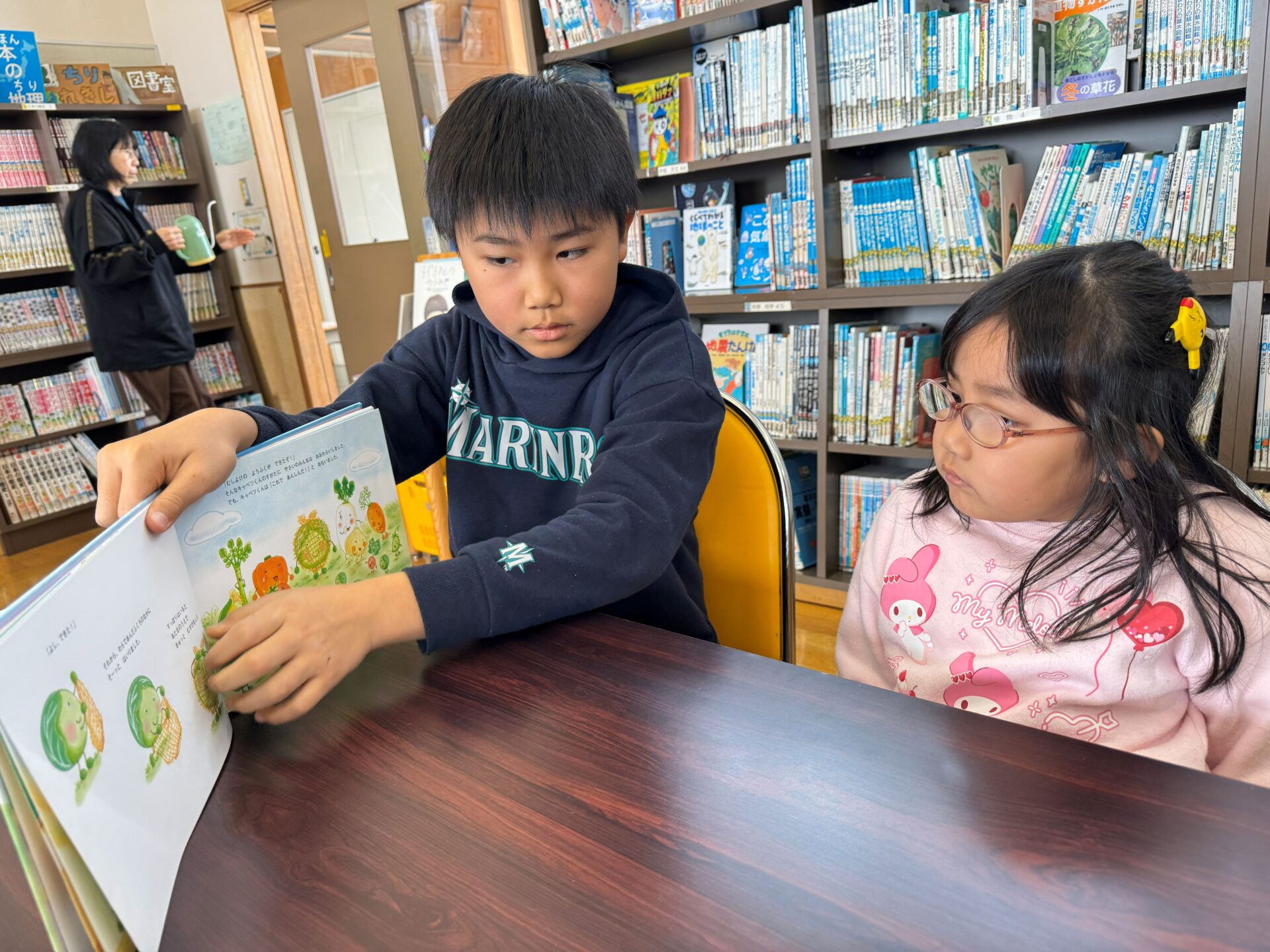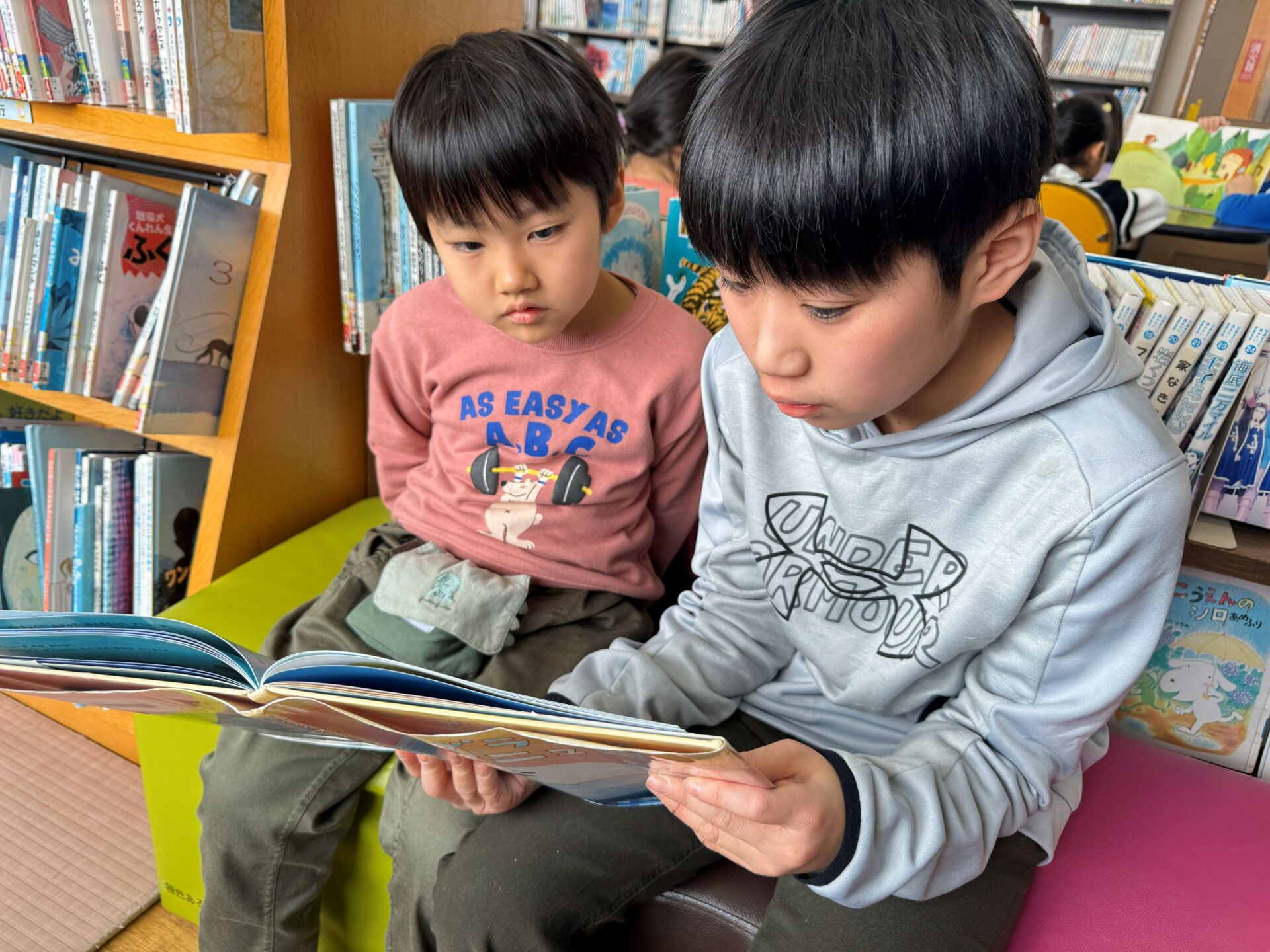 図書室に移動し、読み聞かせもしてもらいました。本がたくさんある学校の図書室に驚く子ども達。お兄さんお姉さんが松組さんに選んでくれた絵本だけでなく、子ども達が好きな絵本を選んで読んでもらう姿もありました📖