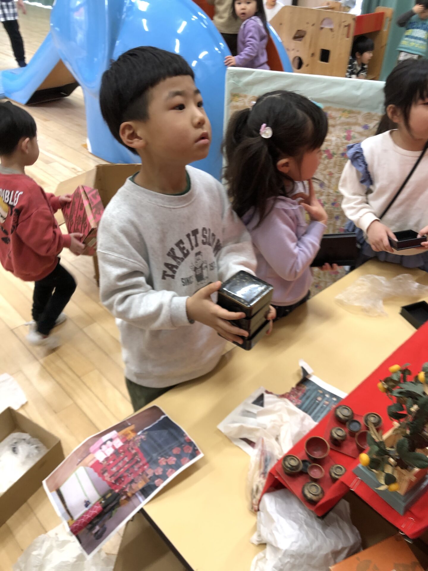 来週の3月3日は、いよいよひなまつり🎎😊✨こども園のひな人形も子ども達が飾ってくれました🎎 竹組さんはひな人形制作や、ひなあられのふるまいごっこを楽しんでいます✨素敵な衣装を着て、すっかり気分はおひなさまおだいりさまかな😊❓