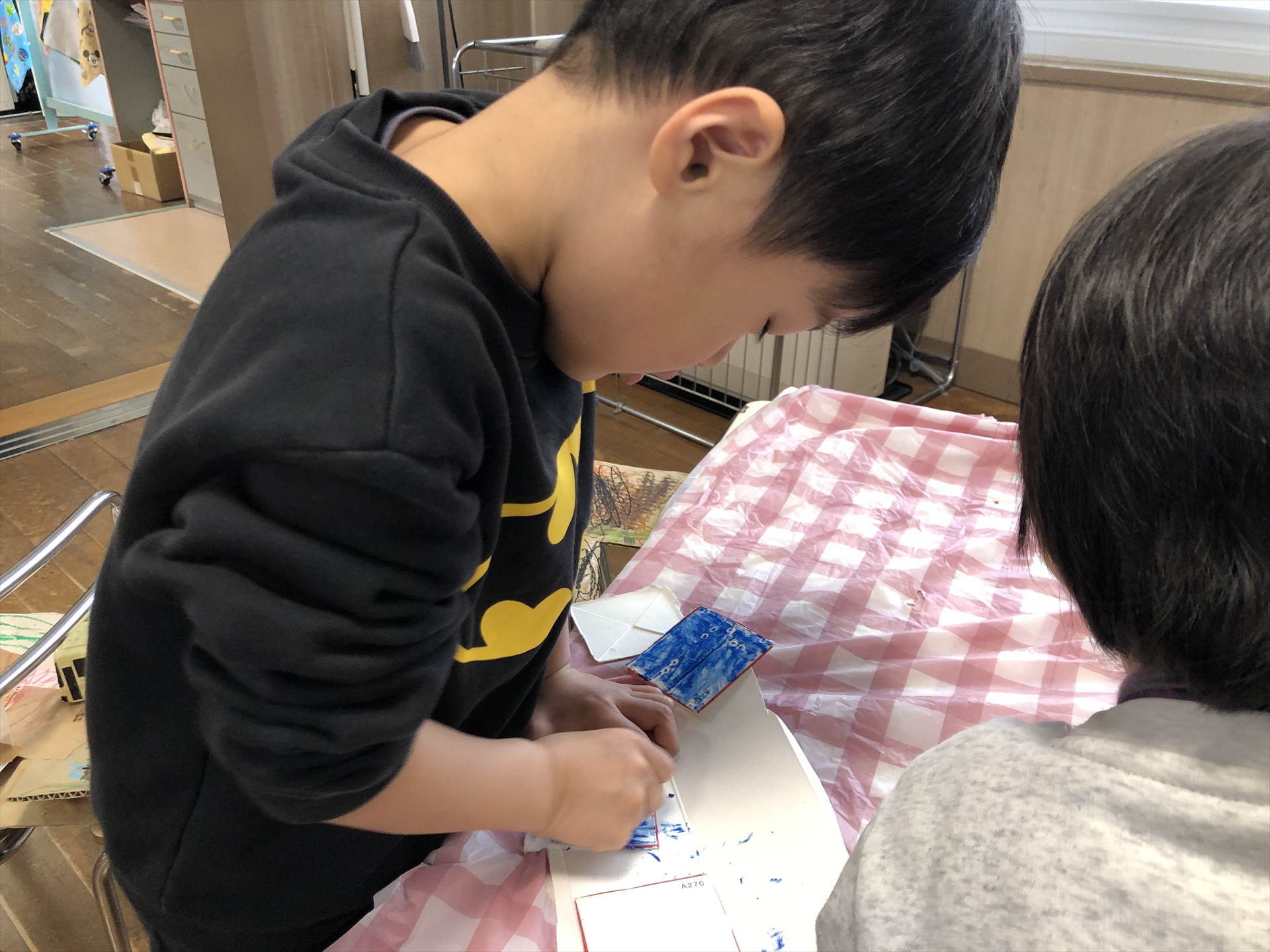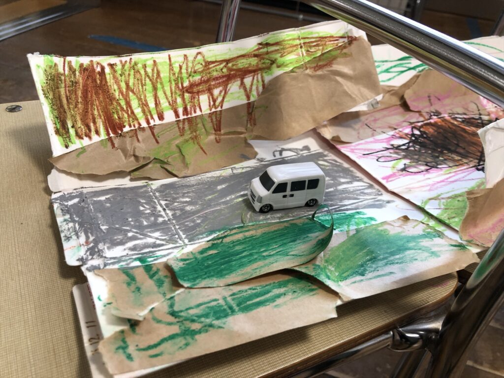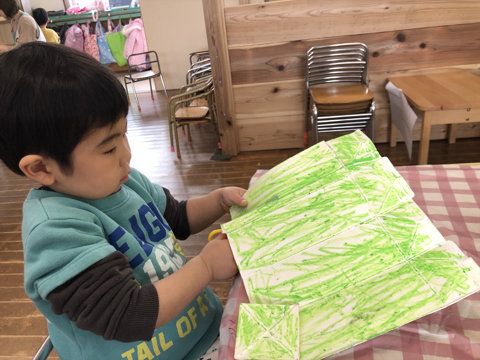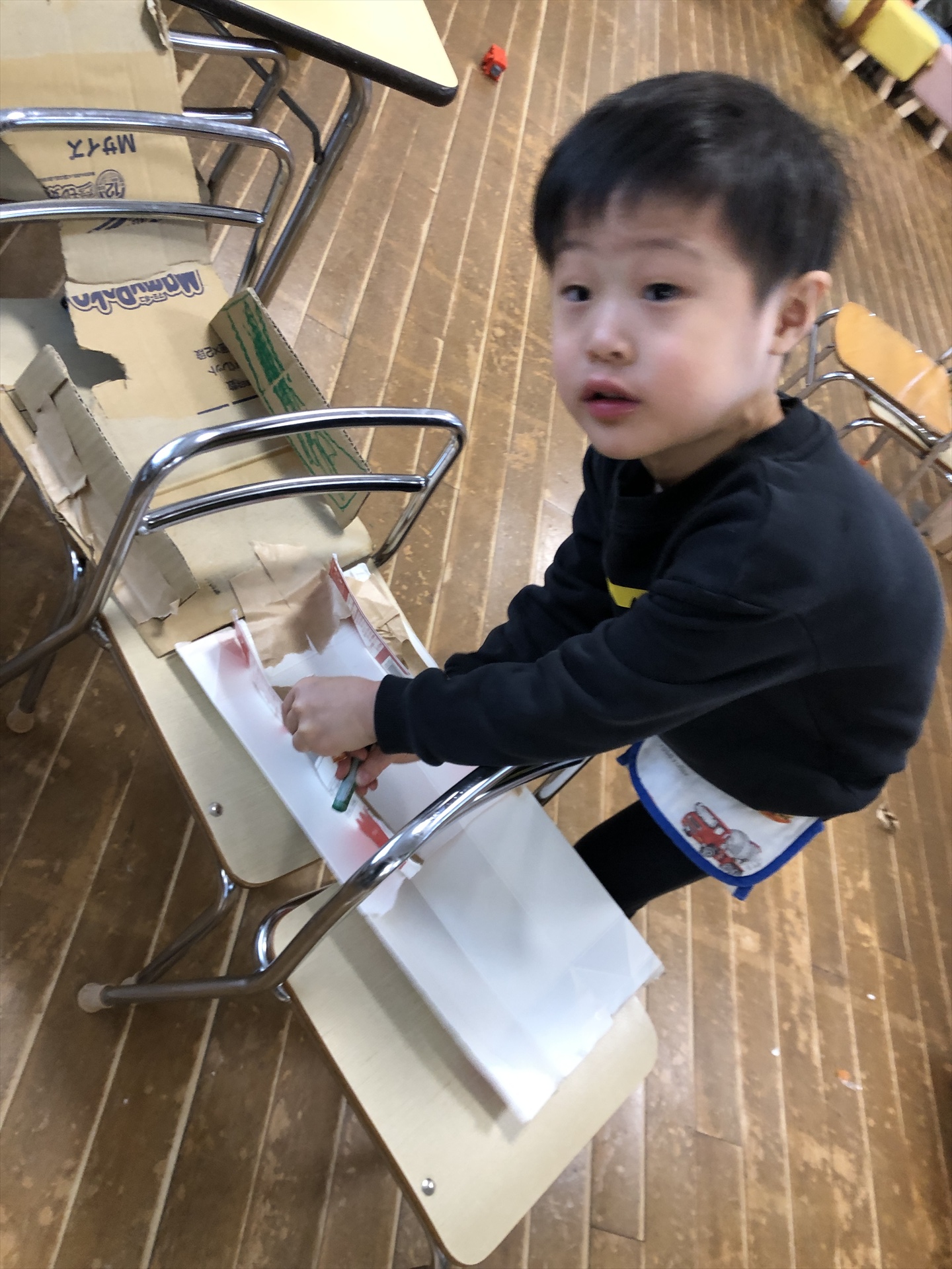 自分達で材料切ったり、貼ったりしてコースをどんどん長くつなげていくうちに、今度はクレヨンで色を塗り始めました。