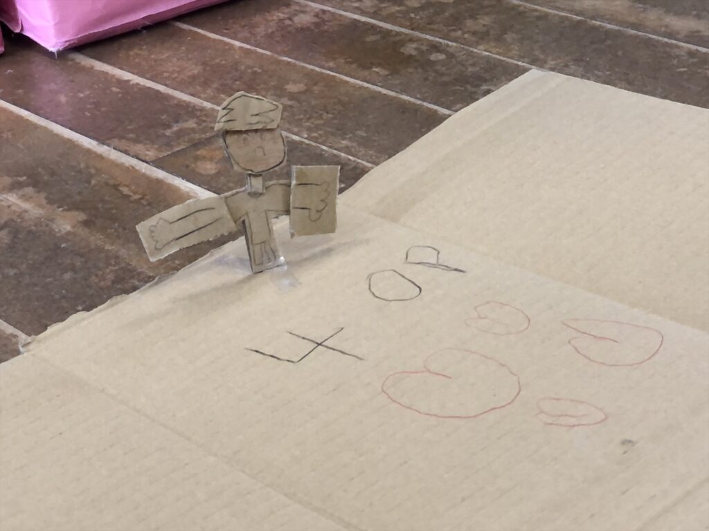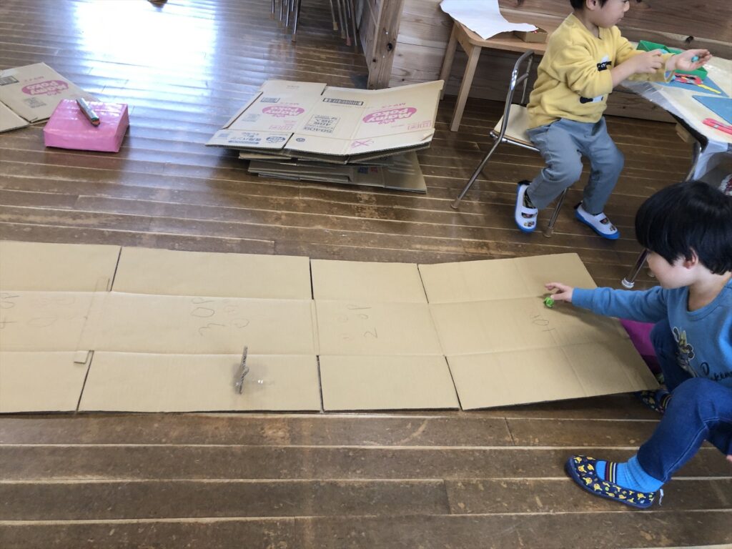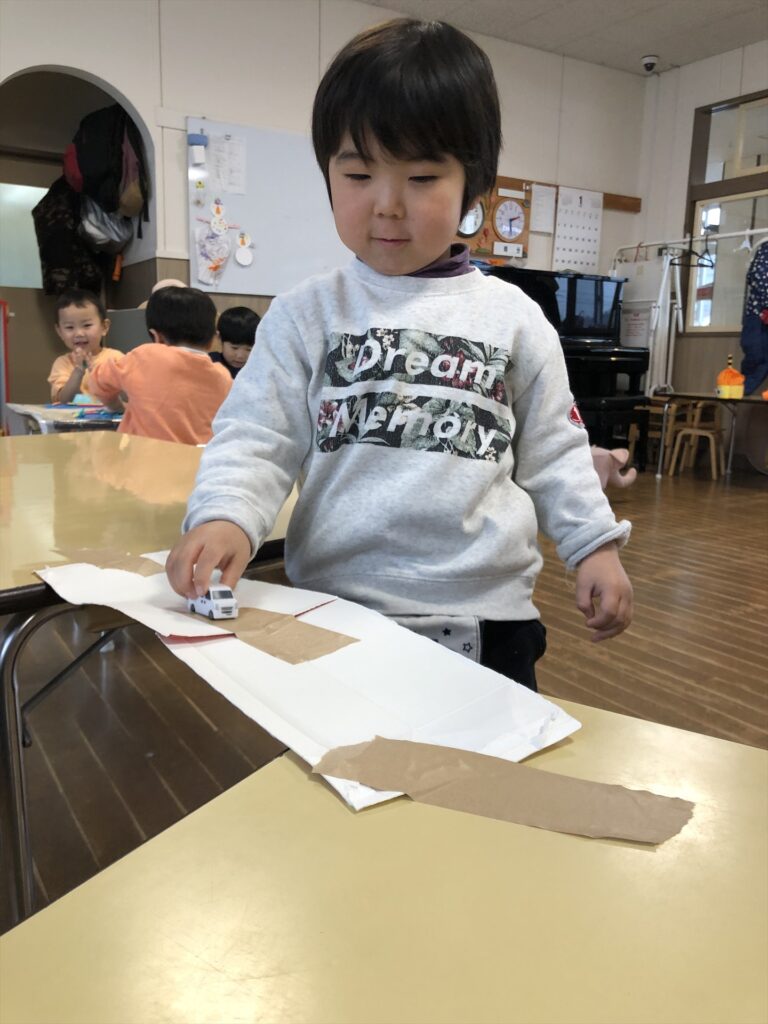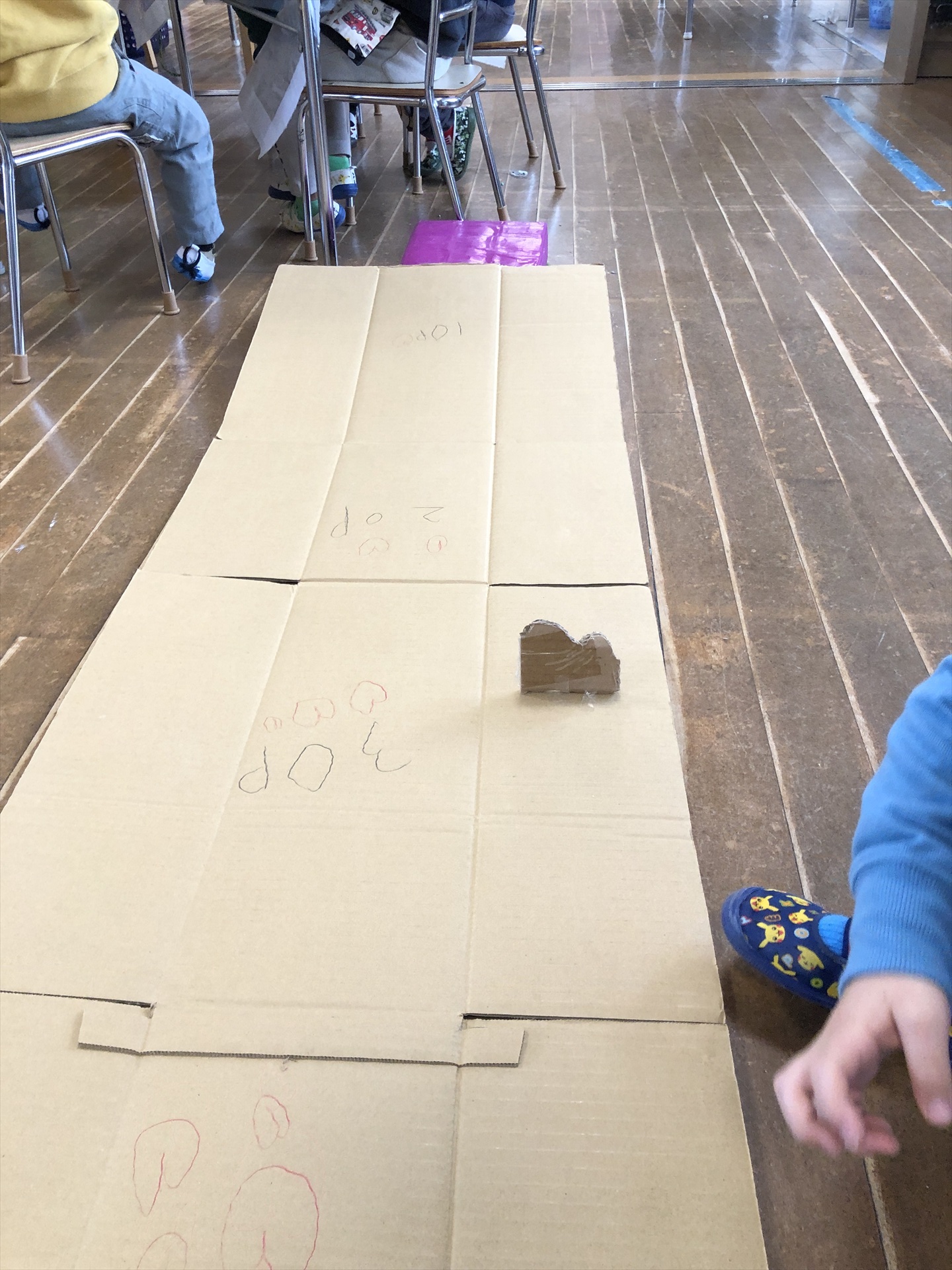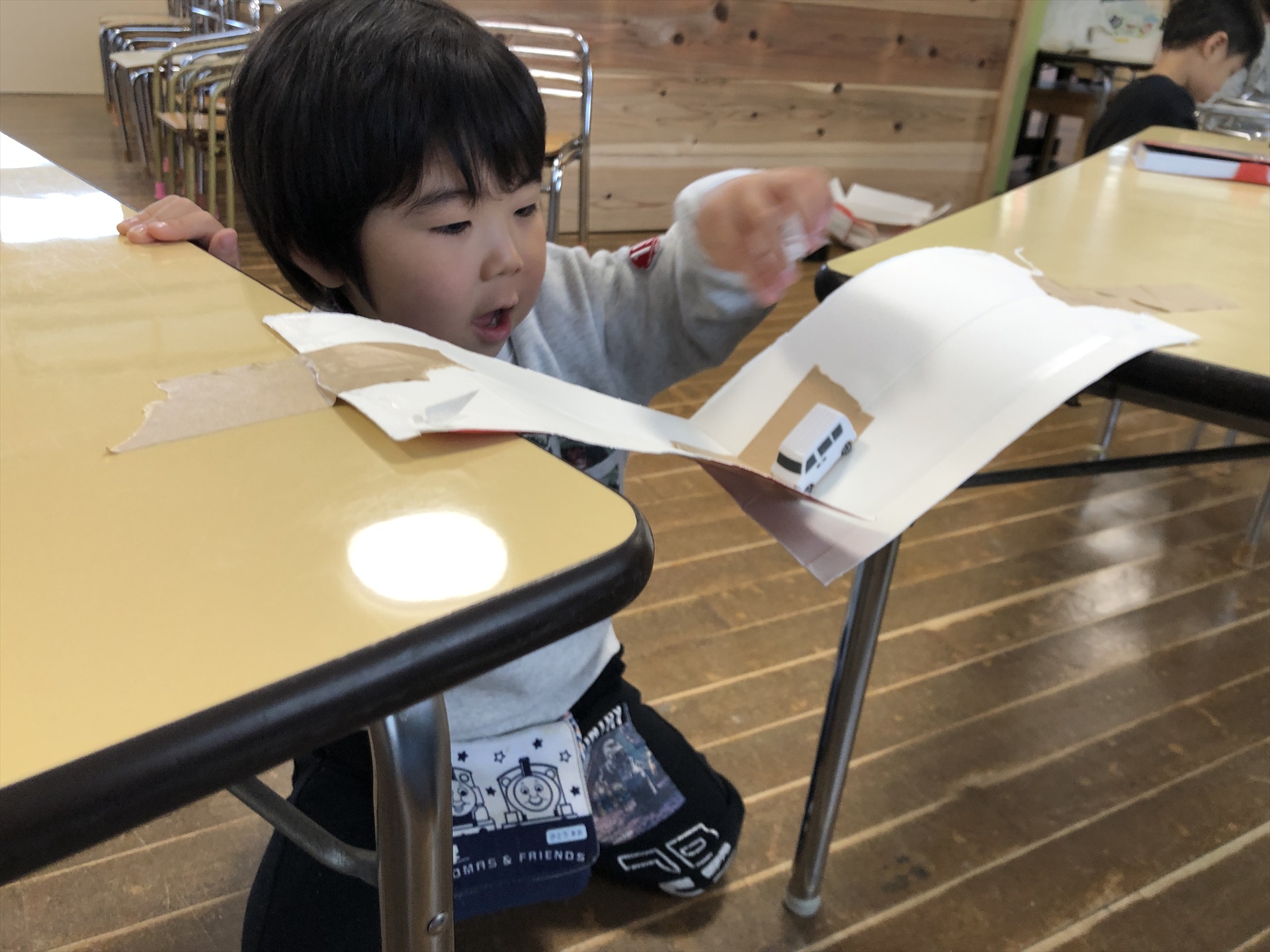 ミニカーや折り紙を丸めたボールを転がして止まったところの点数を競って遊ぶコースを年上児と一緒に楽しんでいます。