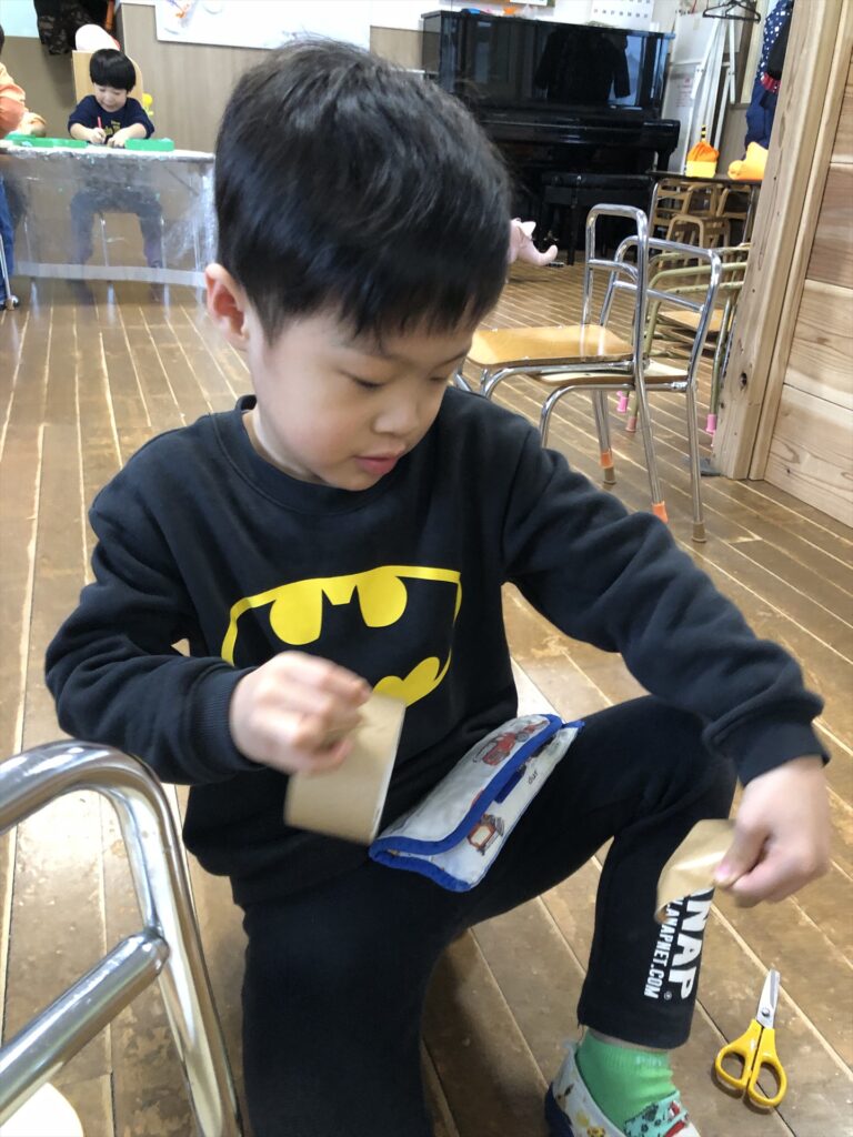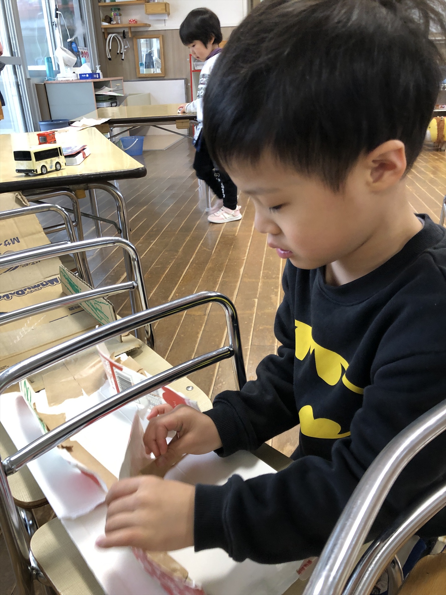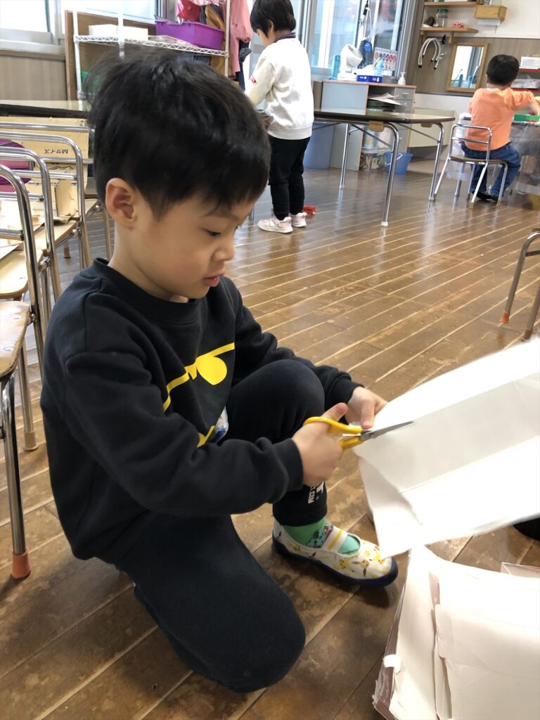 椅子と段ボールを使ってコースを作っている姿があり、牛乳パックやテープを持って来てみると、早速はさみやテープを使ってコースを伸ばし始めました。