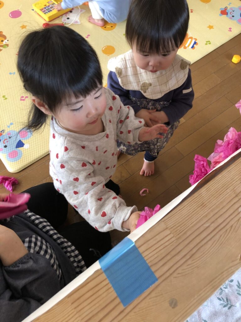 ひよこ組では、お花紙を使って桃の花アートを楽しんでいましたよ。