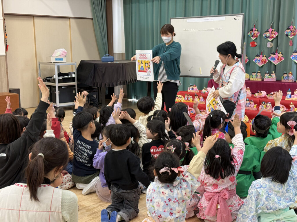 初めに、子ども達とひなまつりにちなんだクイズを出題!どの問題も「簡単♪」と次々と正解していました。