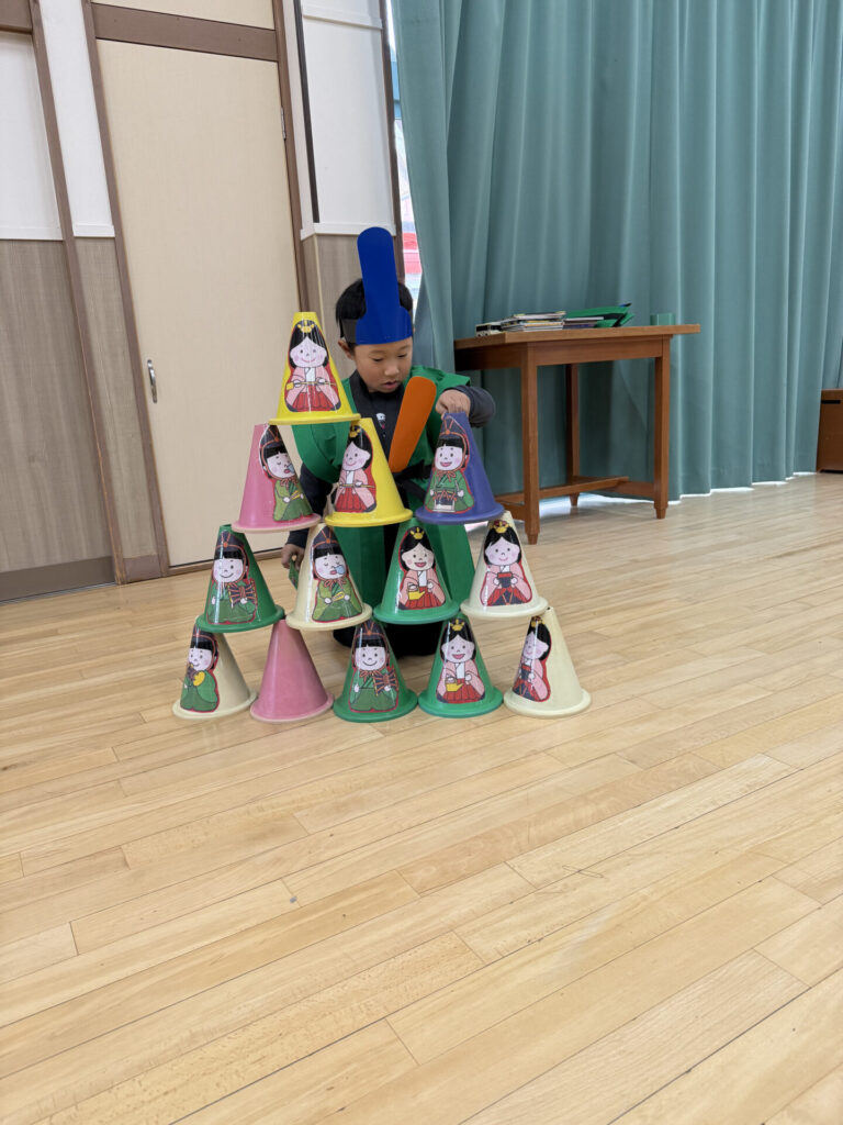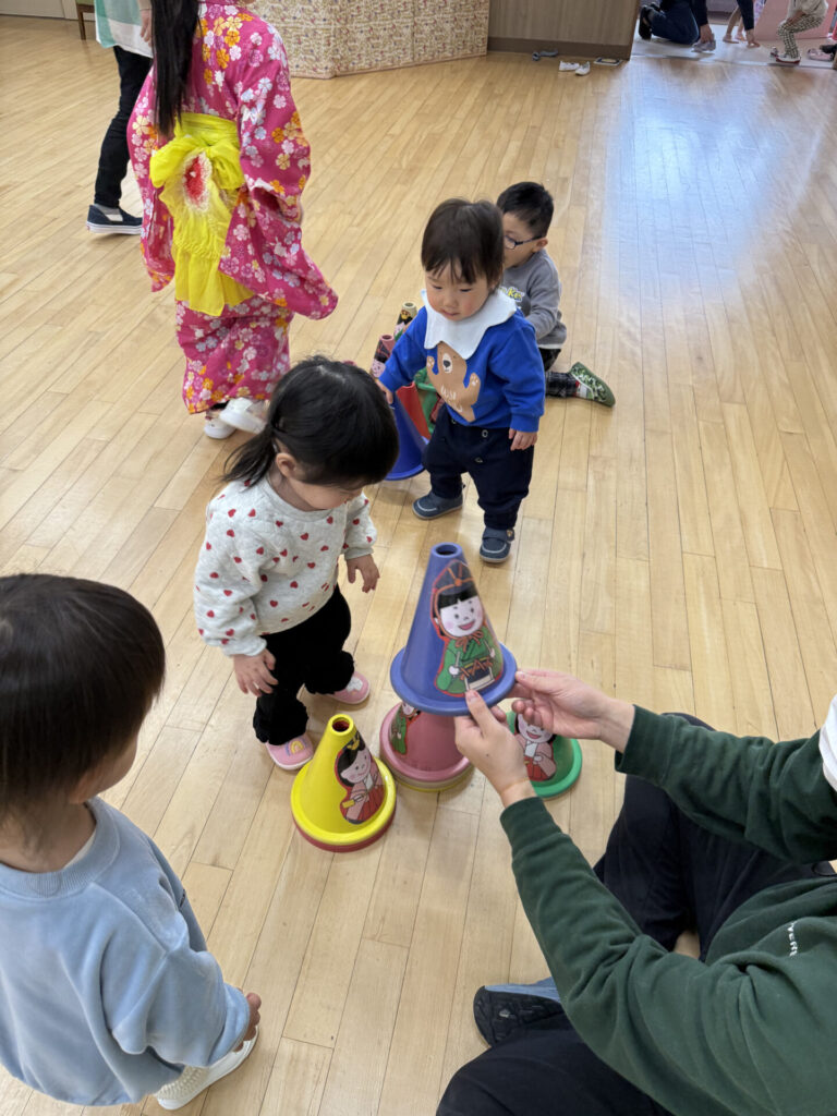 遊戯室では発表コーナーとコーンを使ったお雛様タワーコーナー。お気に入りの曲で歌や踊りを堂々と発表してくれたり、コーンを高く積み上げようと何度も挑戦している姿が見られました。