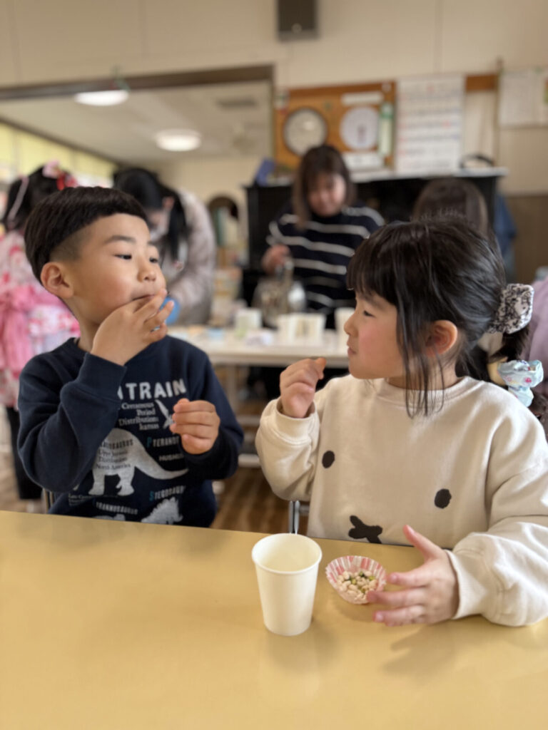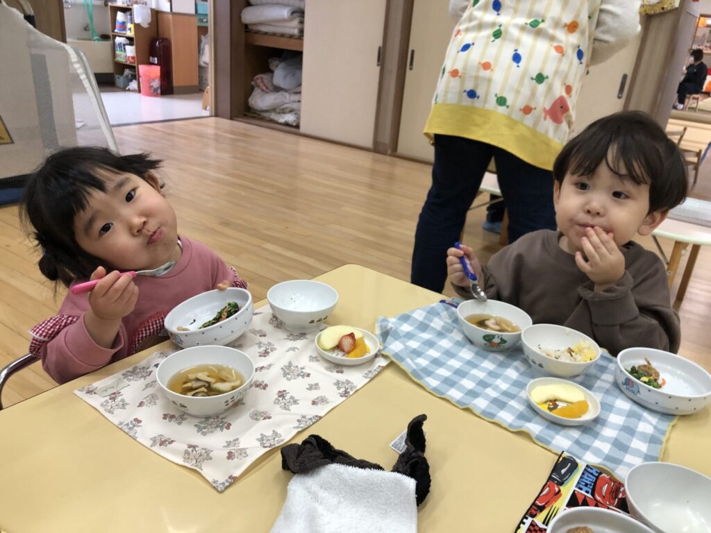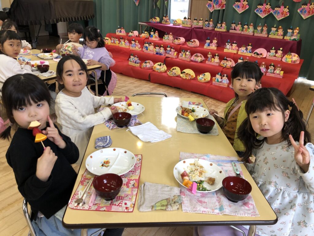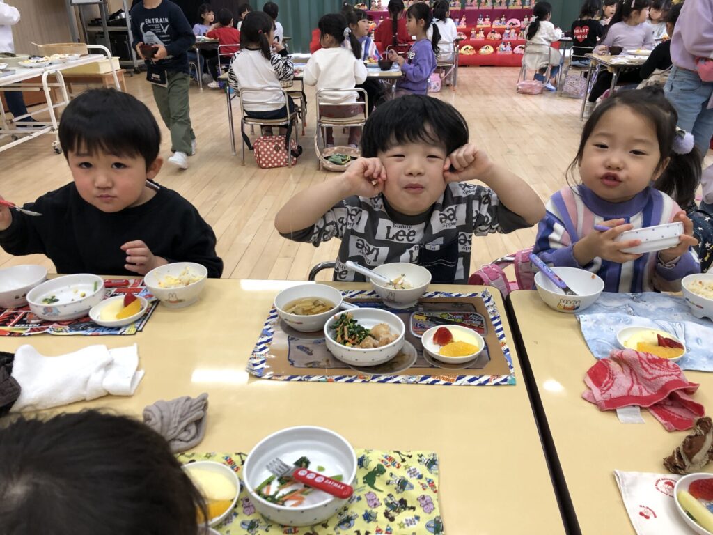 沢山遊んだ後は、お待ちかねのひなまつり給食。ちらし寿司や唐揚げ、フルーツスティックなど彩豊かなメニューに子ども達も食欲を刺激され、「おいしかったからもう一回食べる」「もっとおかわりしていい?」などの声があがり、おかわりもたくさん食べてお腹も心も満足になったようです。
