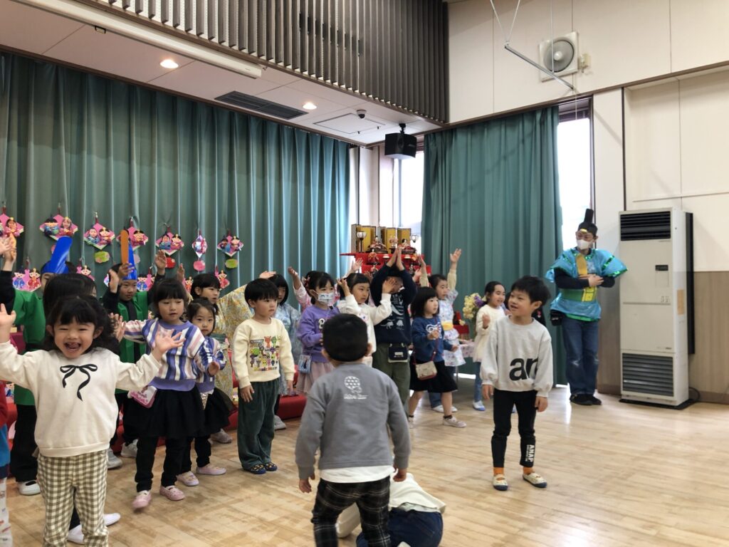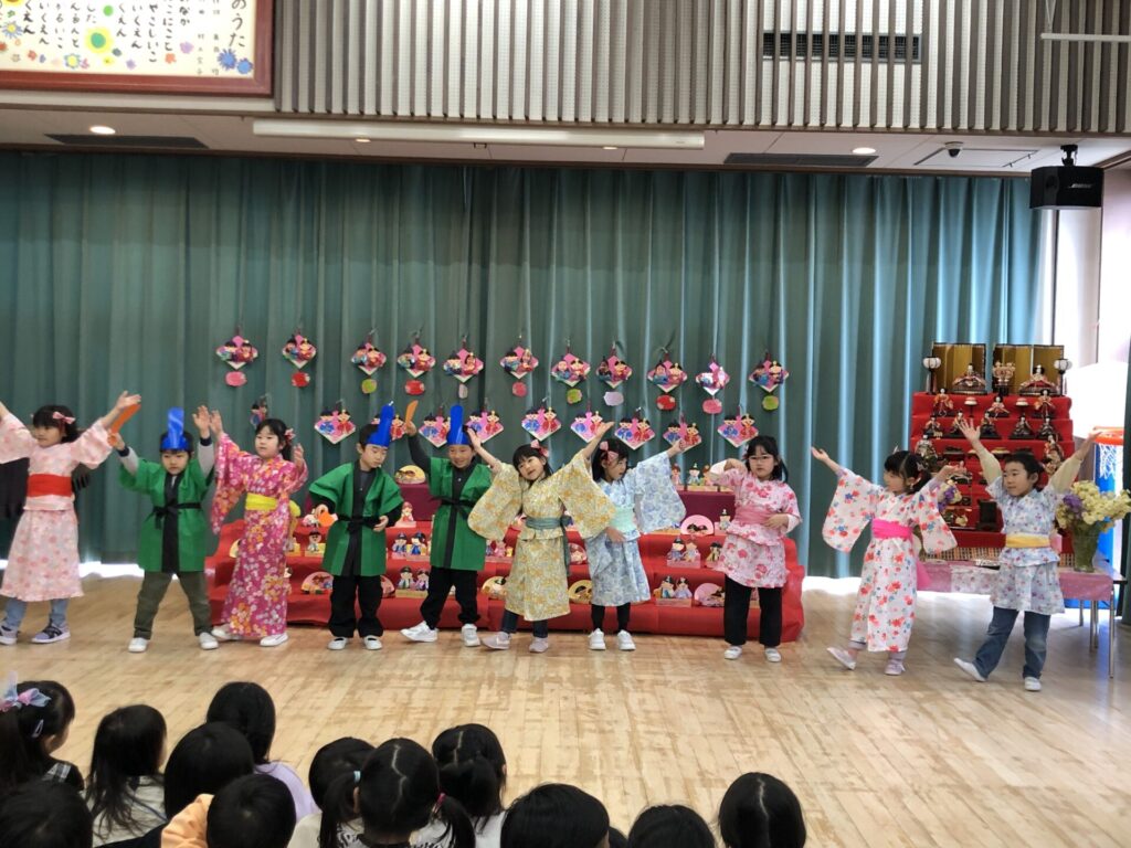 松組の遊戯を見たら、竹組、梅組、桜組も踊りたくなってウズウズ♪お雛様、お内裏様も加わりにぎやかな発表になりました。
