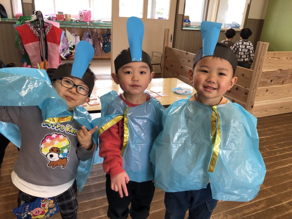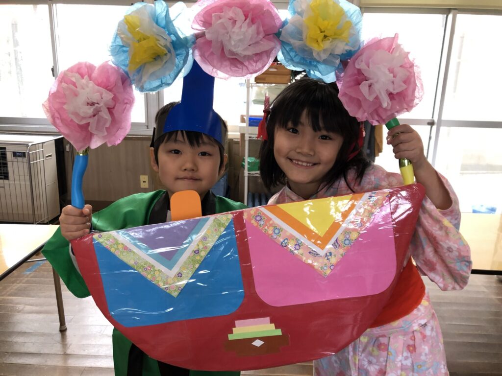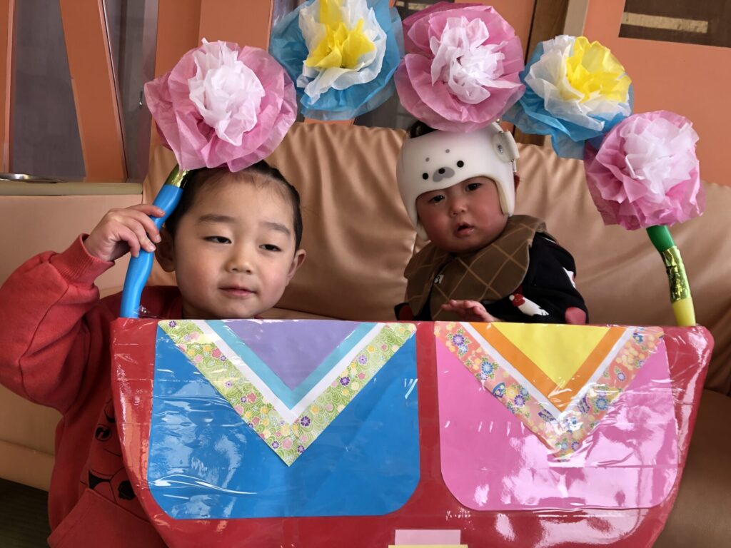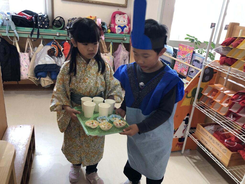 本日はひなまつり!子ども達にどんなひなまつりにしたいかを聞いていくと、「歌や踊りの発表を見せたい!」「お雛様とお内裏様に来てほしい」「お店屋さんになってカルピスとひなあられが食べたい」などの声が!!遊戯室に子ども達の作ったお雛様も飾り、松組は浴衣や法被を着たりとひなまつりムードが高まってきた所で、いよいよひなまつり会開始です。