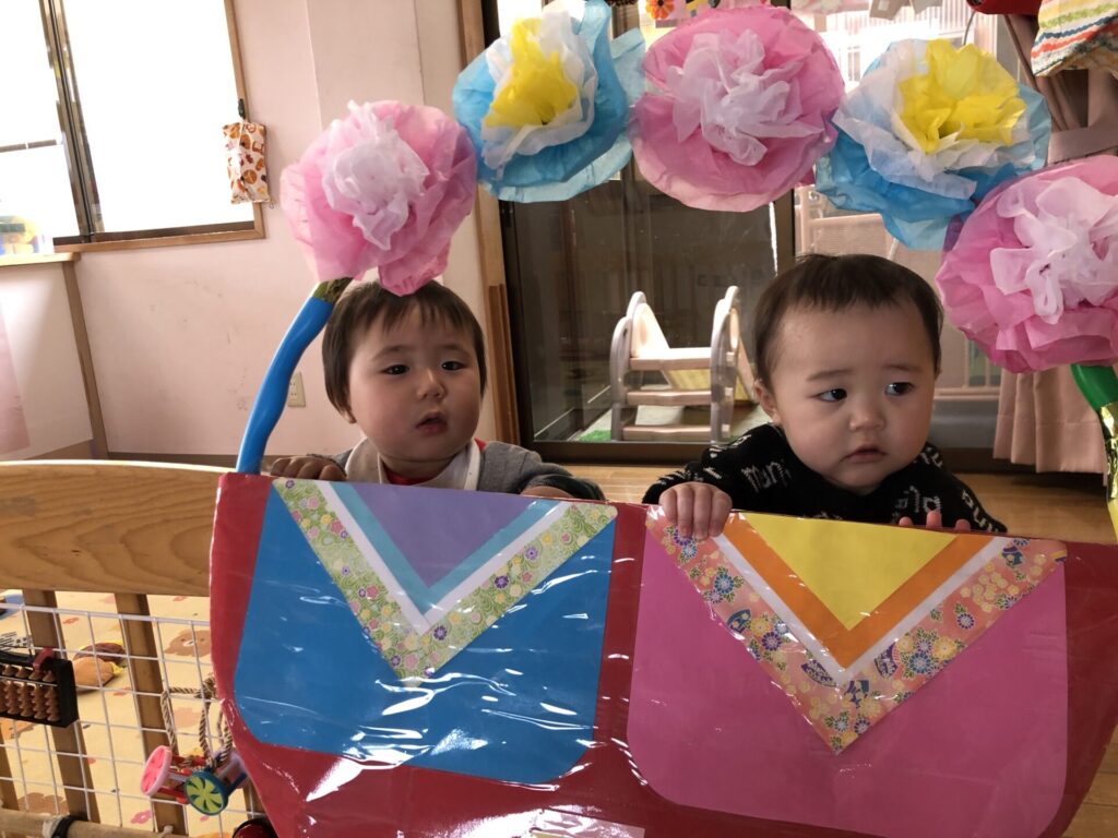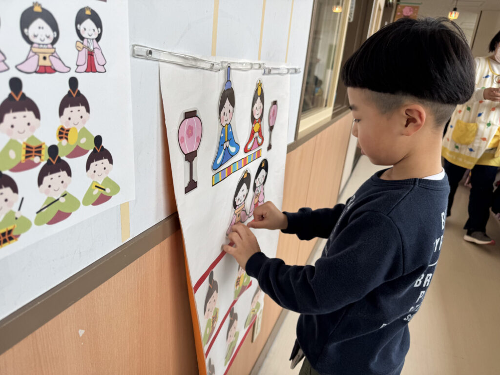 お雛様たちが帰った後は、各保育室や遊戯室で思い思いにコーナーでひなまつりの雰囲気を楽しみました。