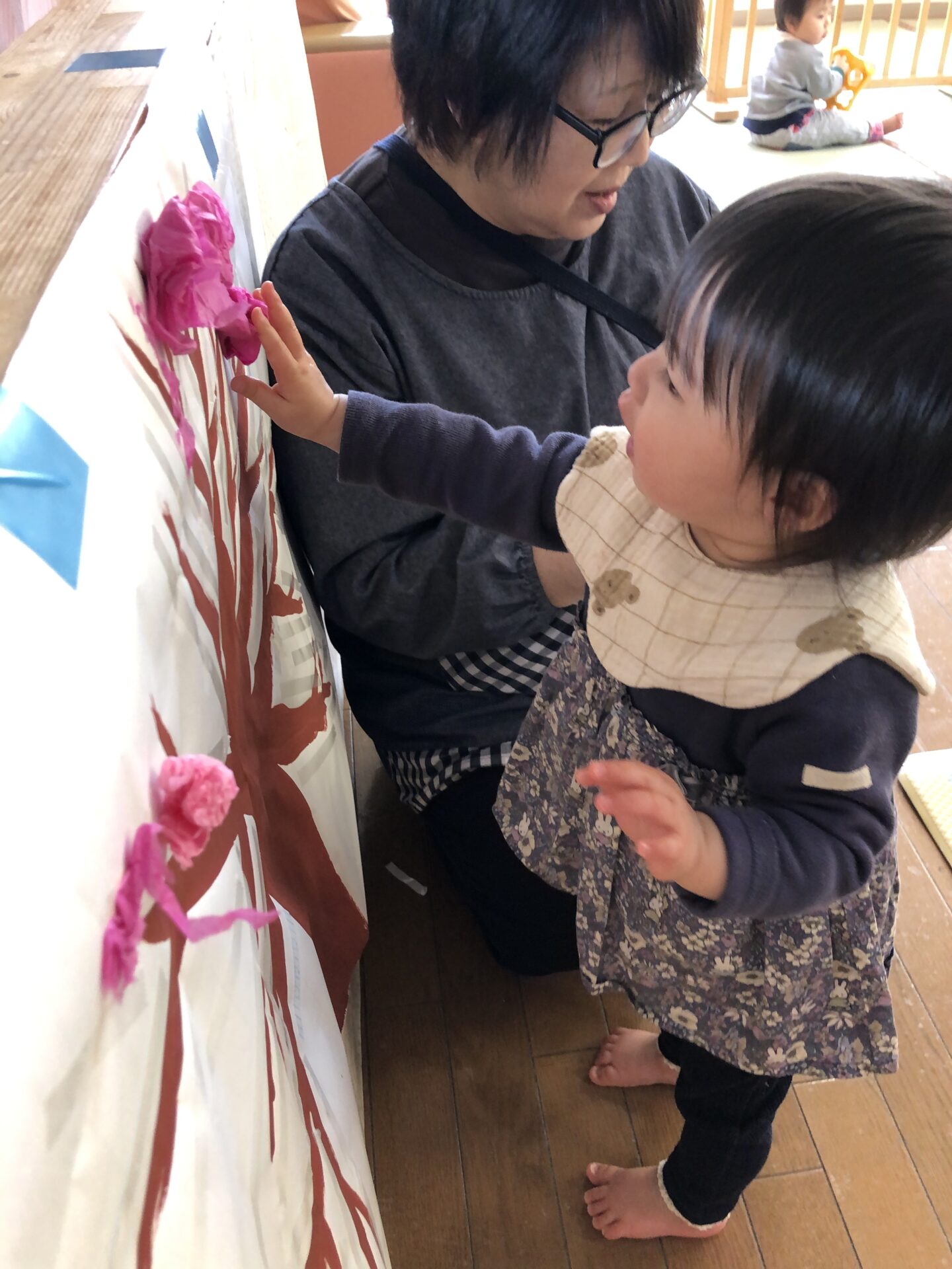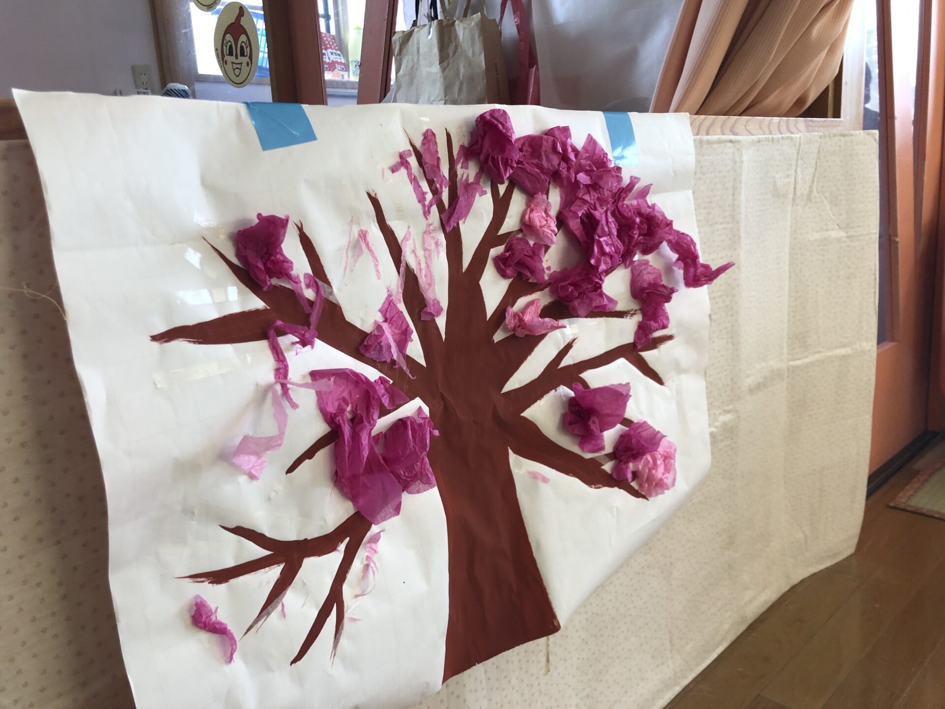 ひよこ組では、お花紙を使って桃の花アートを楽しんでいましたよ。
