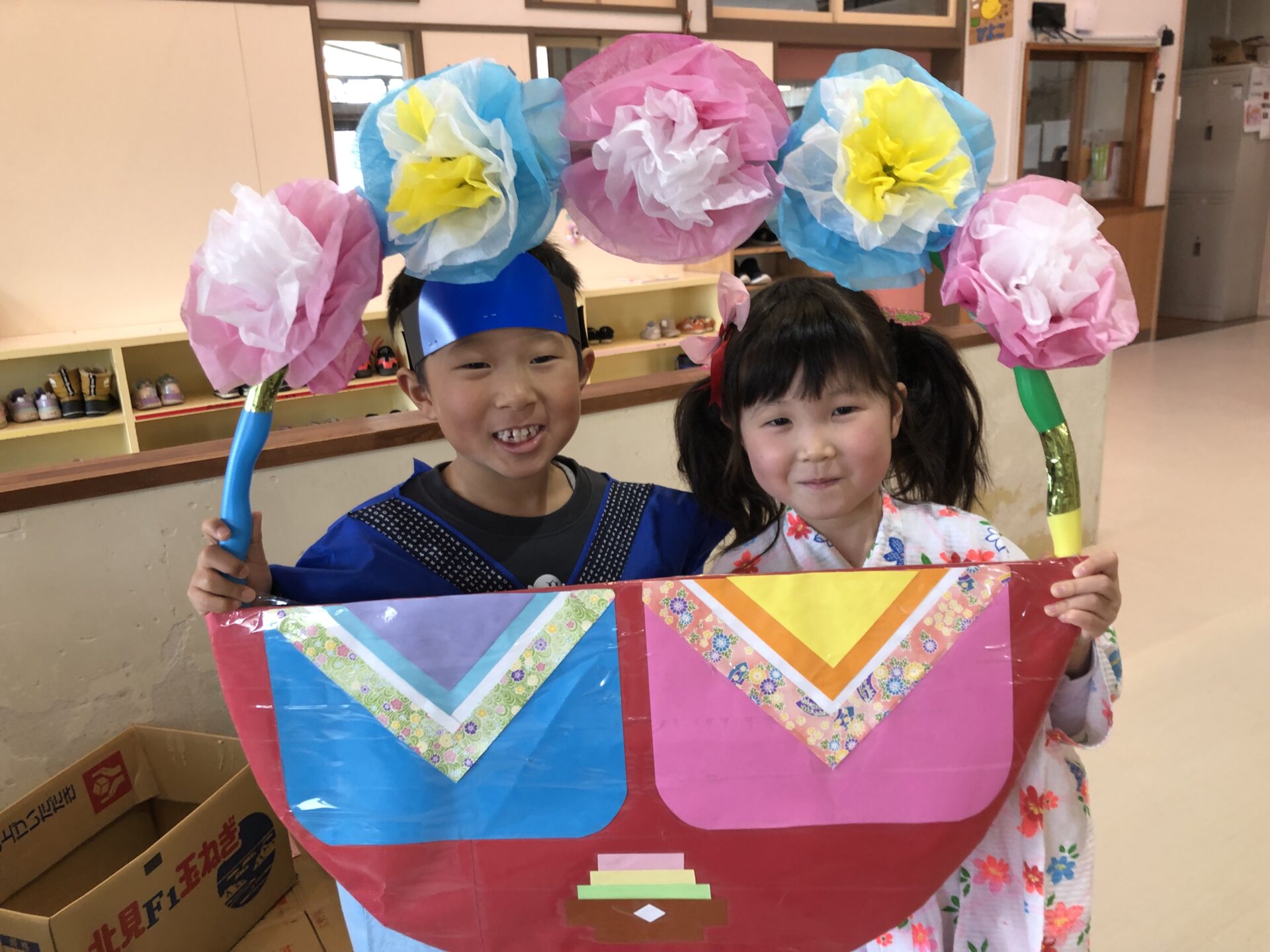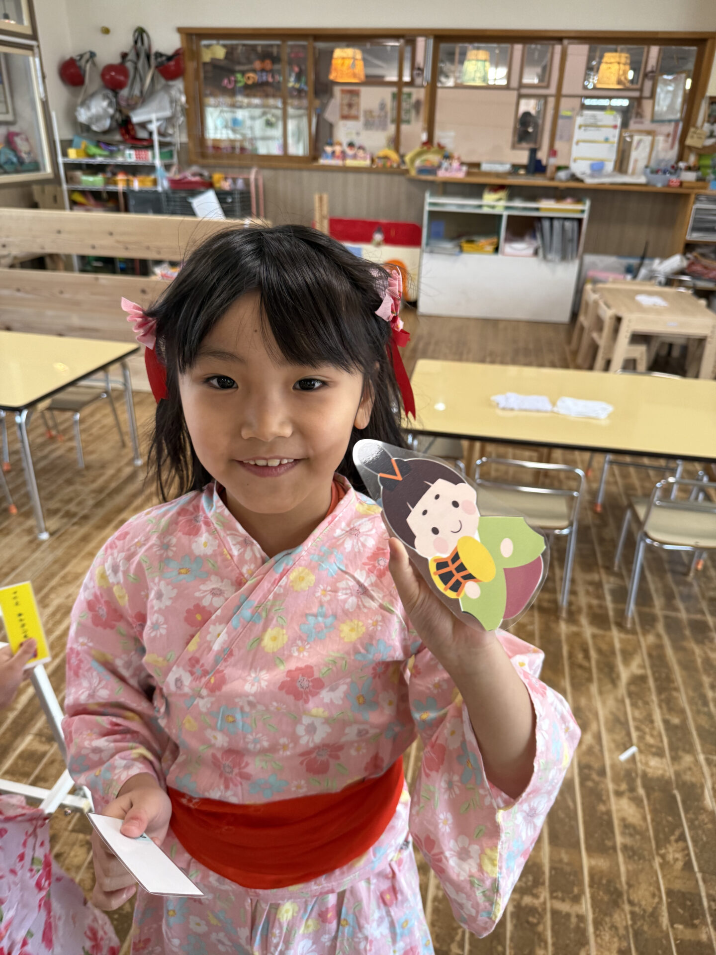 本日はひなまつり!子ども達にどんなひなまつりにしたいかを聞いていくと、「歌や踊りの発表を見せたい!」「お雛様とお内裏様に来てほしい」「お店屋さんになってカルピスとひなあられが食べたい」などの声が!!遊戯室に子ども達の作ったお雛様も飾り、松組は浴衣や法被を着たりとひなまつりムードが高まってきた所で、いよいよひなまつり会開始です。