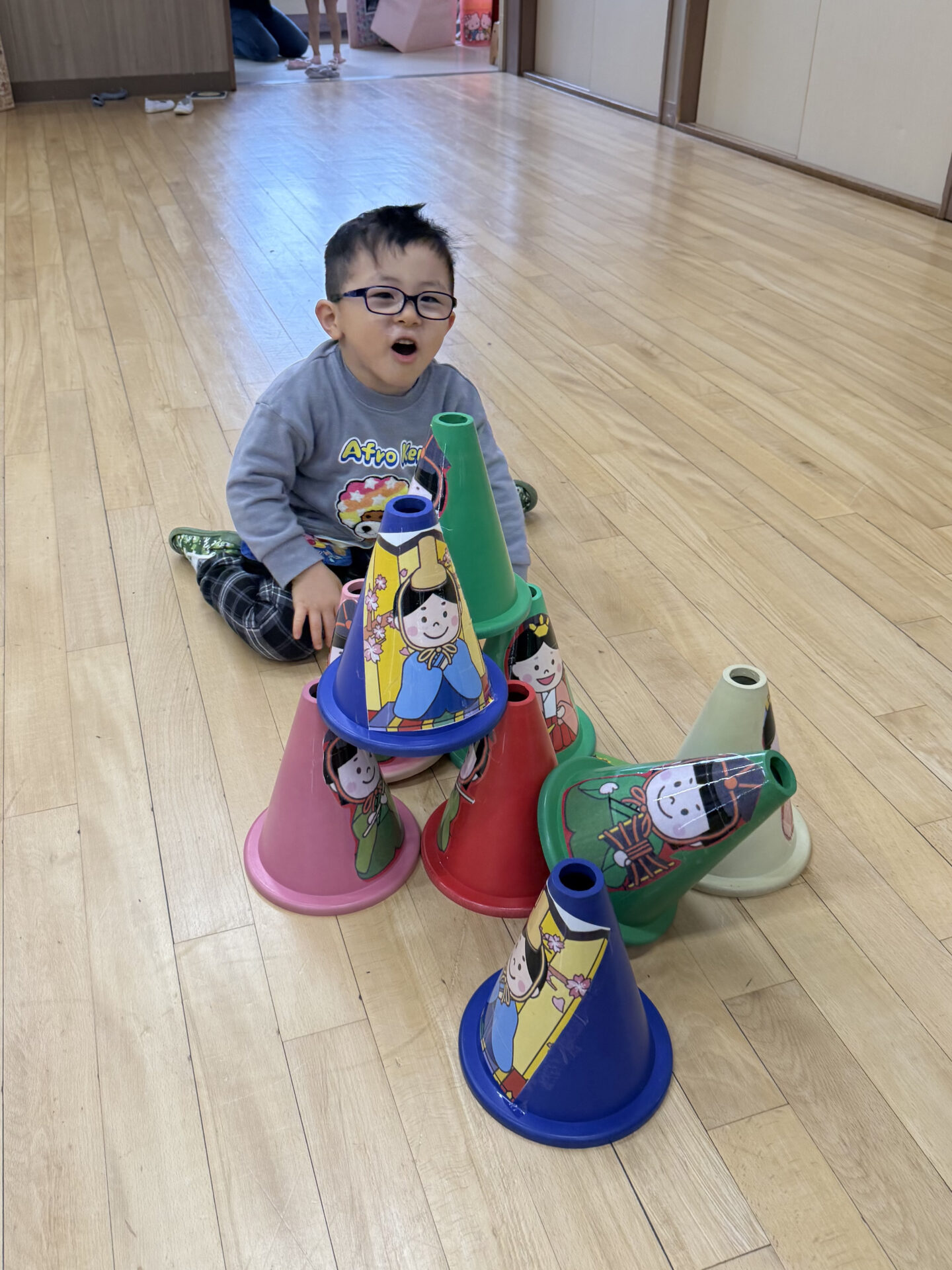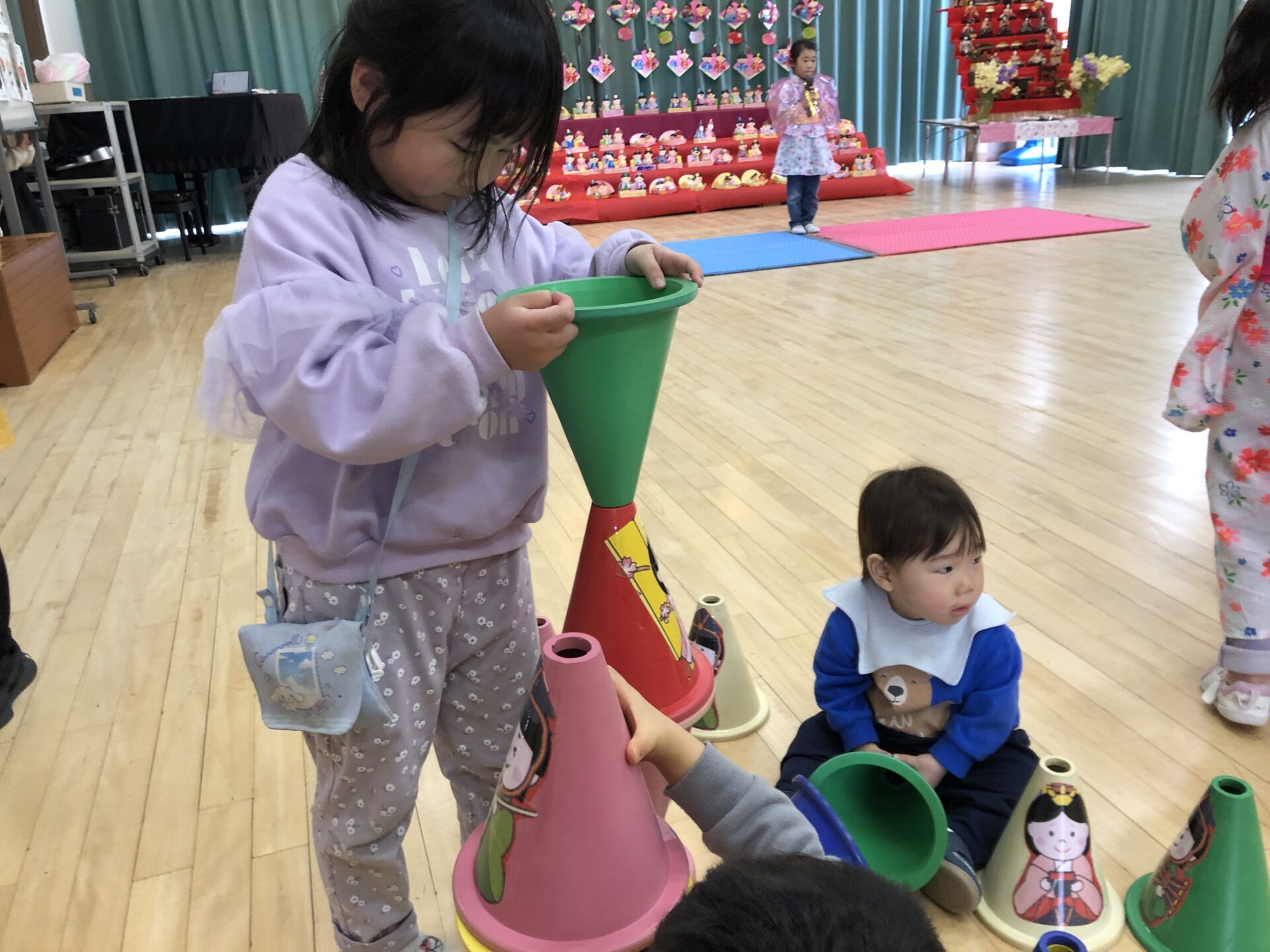 遊戯室では発表コーナーとコーンを使ったお雛様タワーコーナー。お気に入りの曲で歌や踊りを堂々と発表してくれたり、コーンを高く積み上げようと何度も挑戦している姿が見られました。