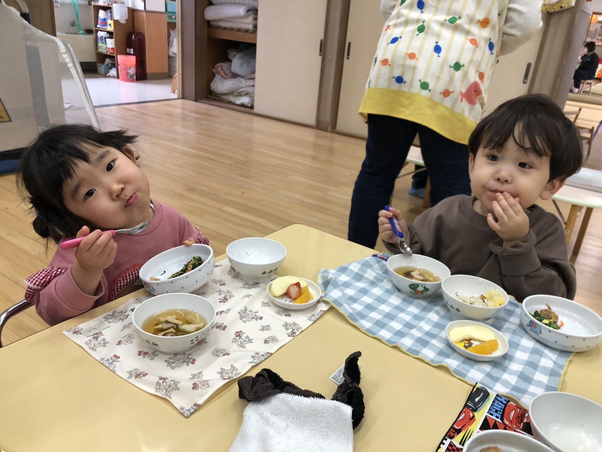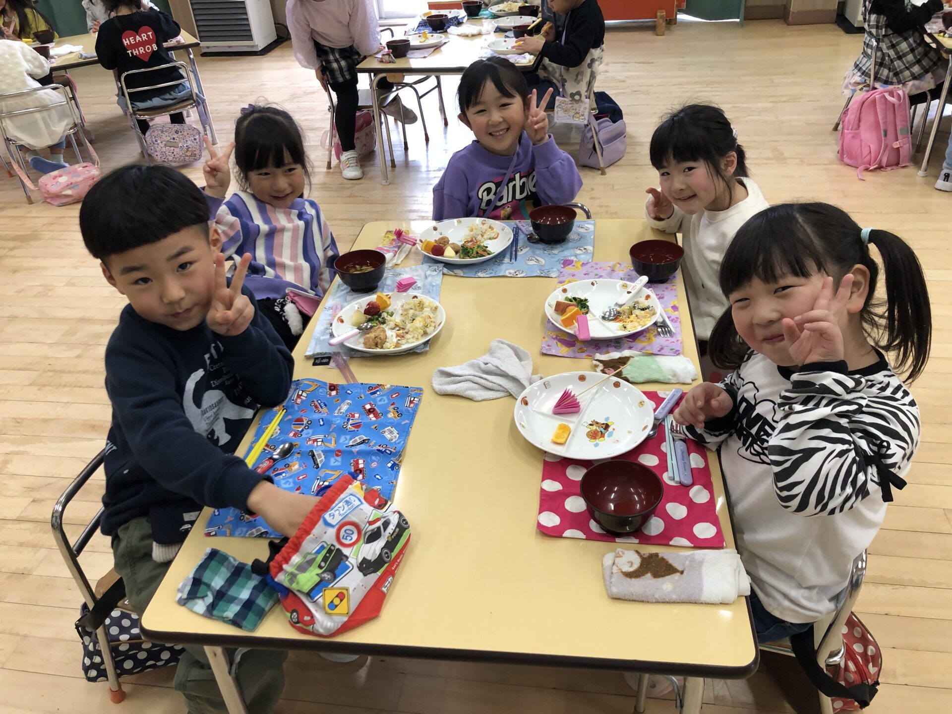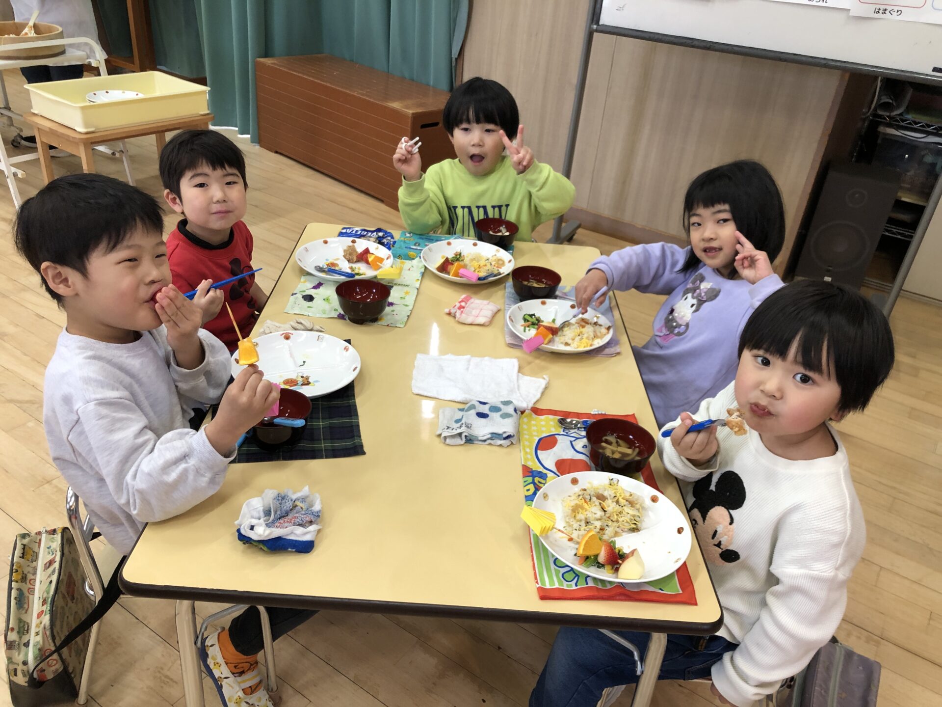 沢山遊んだ後は、お待ちかねのひなまつり給食。ちらし寿司や唐揚げ、フルーツスティックなど彩豊かなメニューに子ども達も食欲を刺激され、「おいしかったからもう一回食べる」「もっとおかわりしていい?」などの声があがり、おかわりもたくさん食べてお腹も心も満足になったようです。