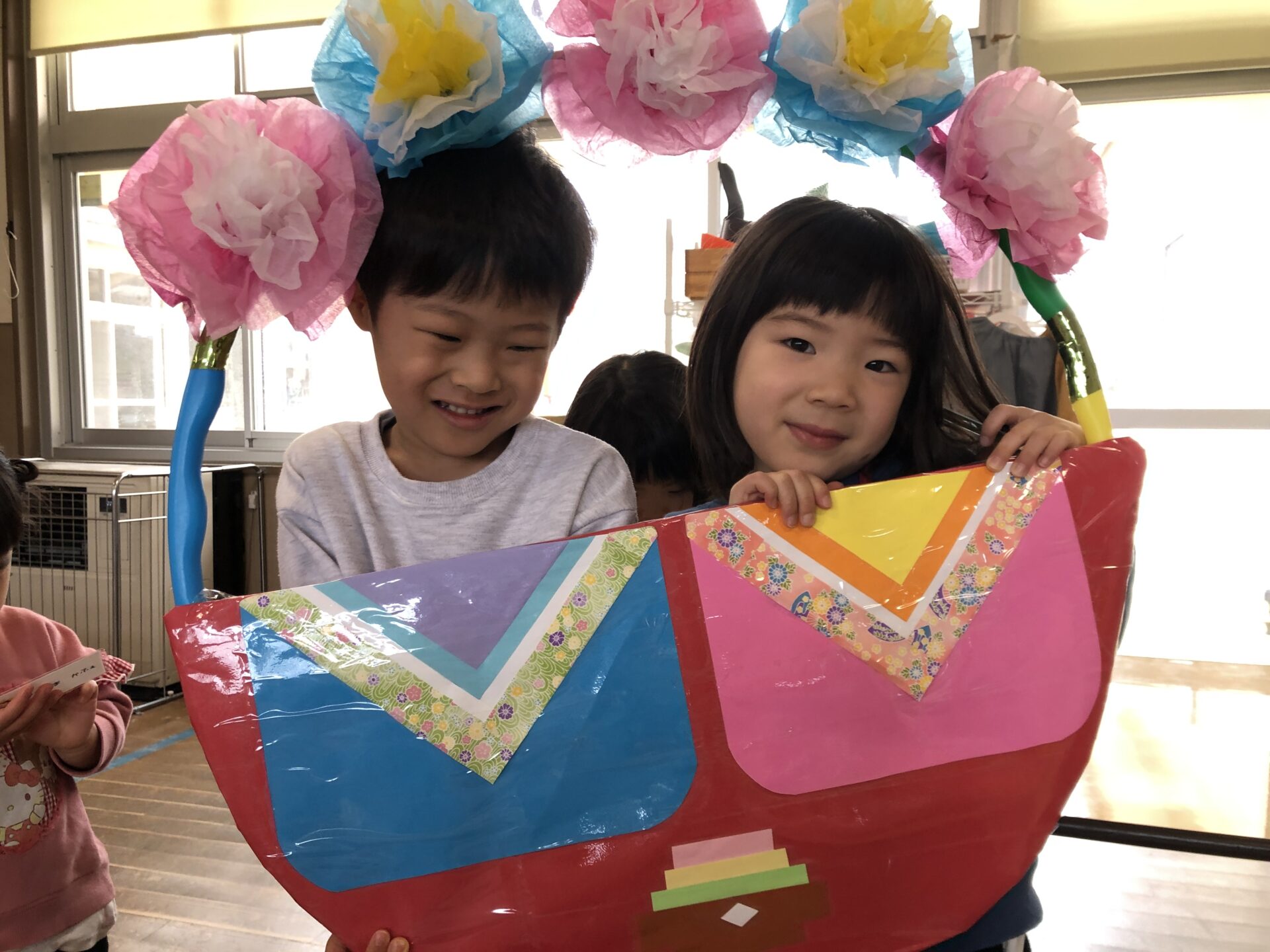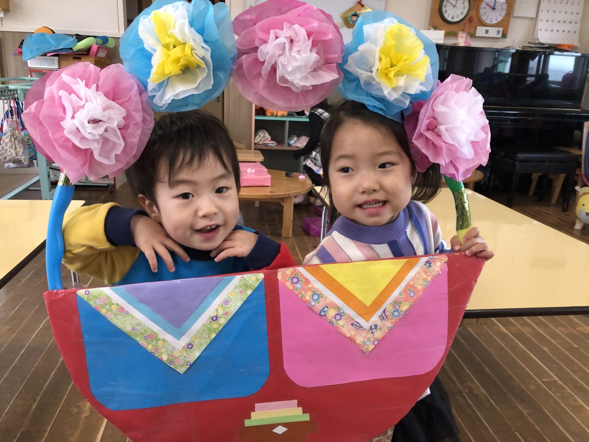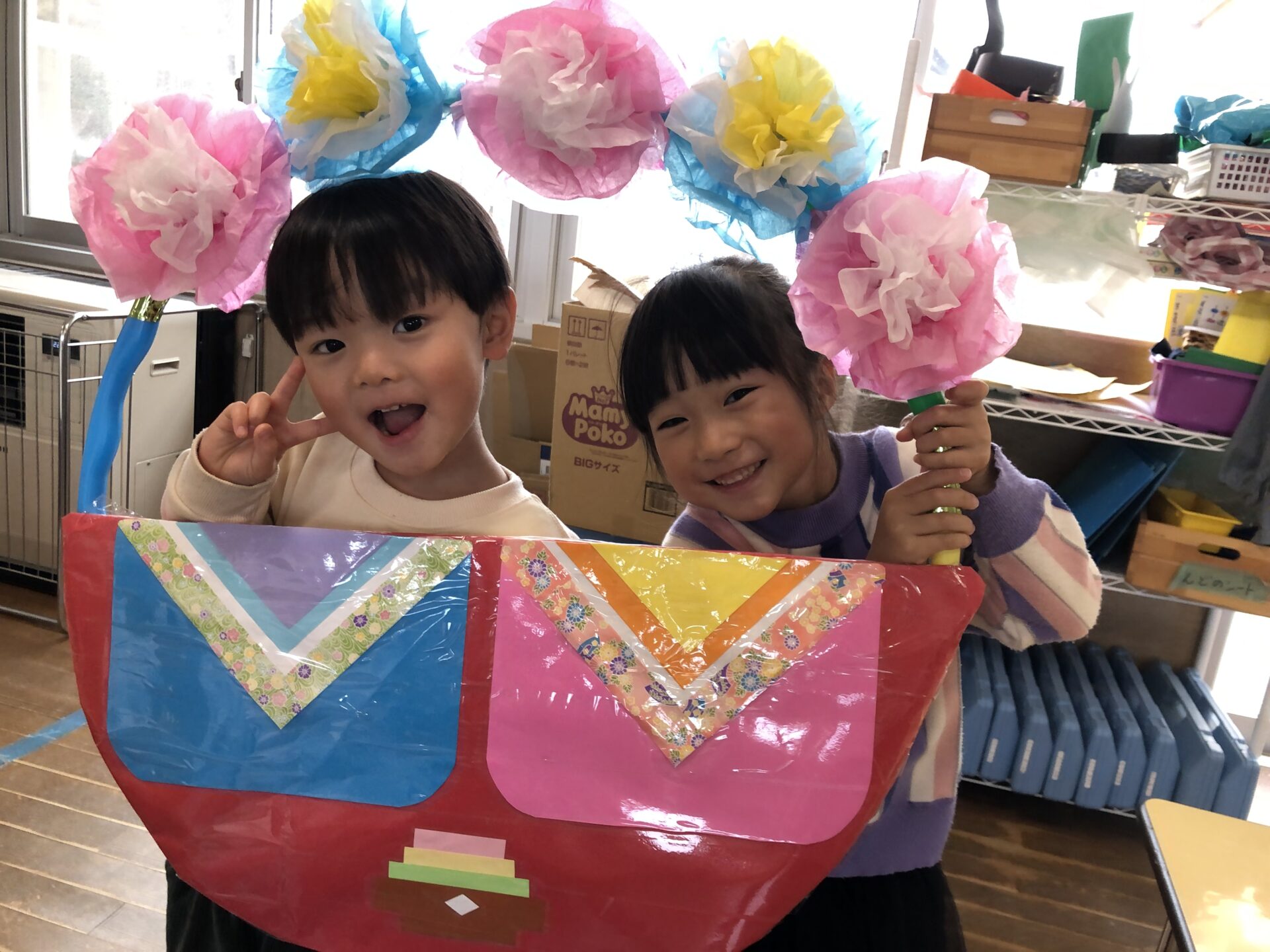 クイズが終わり、お雛様に手紙を書いたことを伝え、来てくれたかなぁとソワソワしながら「出ておいでー!」と呼んでみると、なんとお雛様とお内裏様が登場してくれました!!