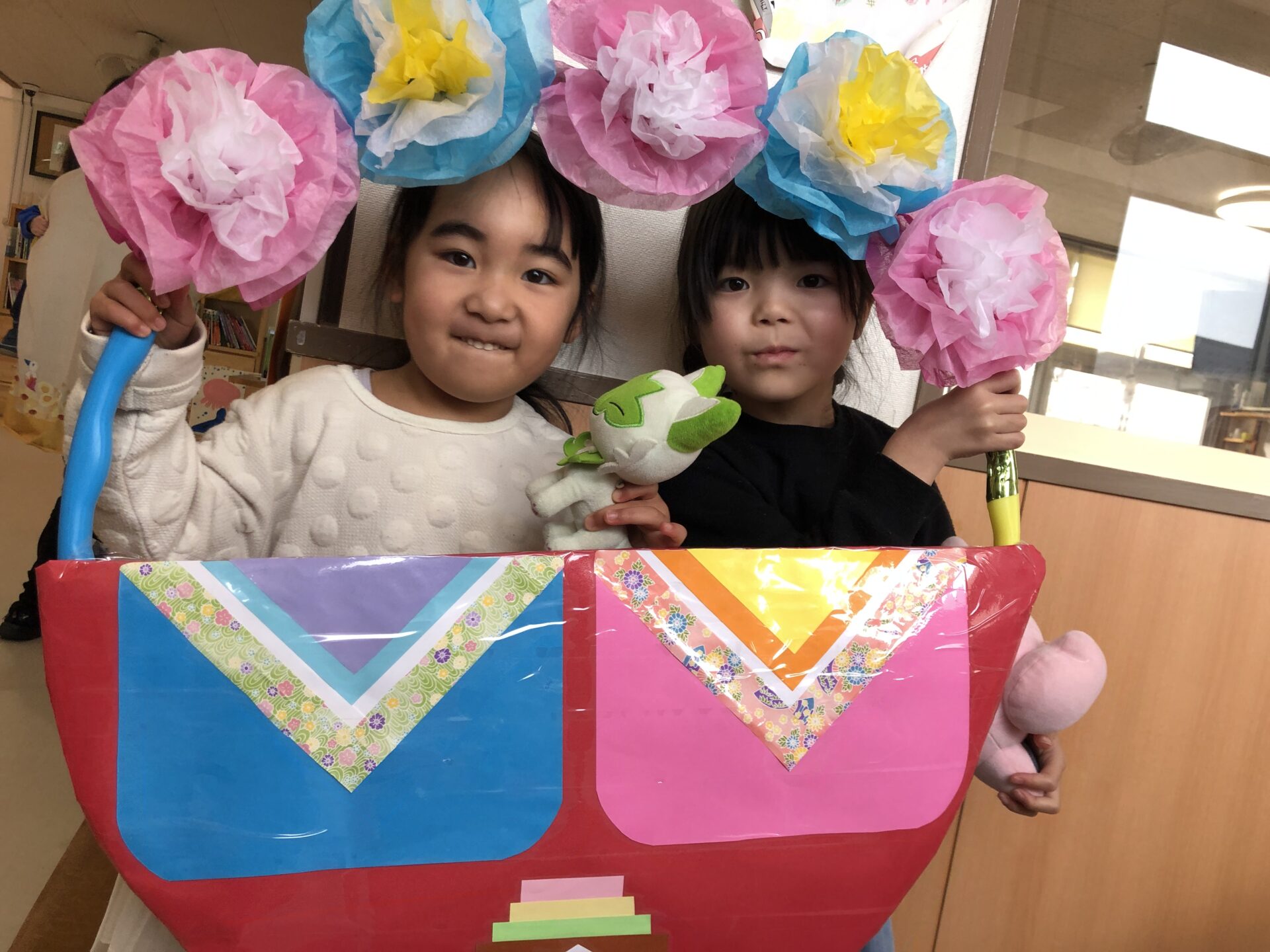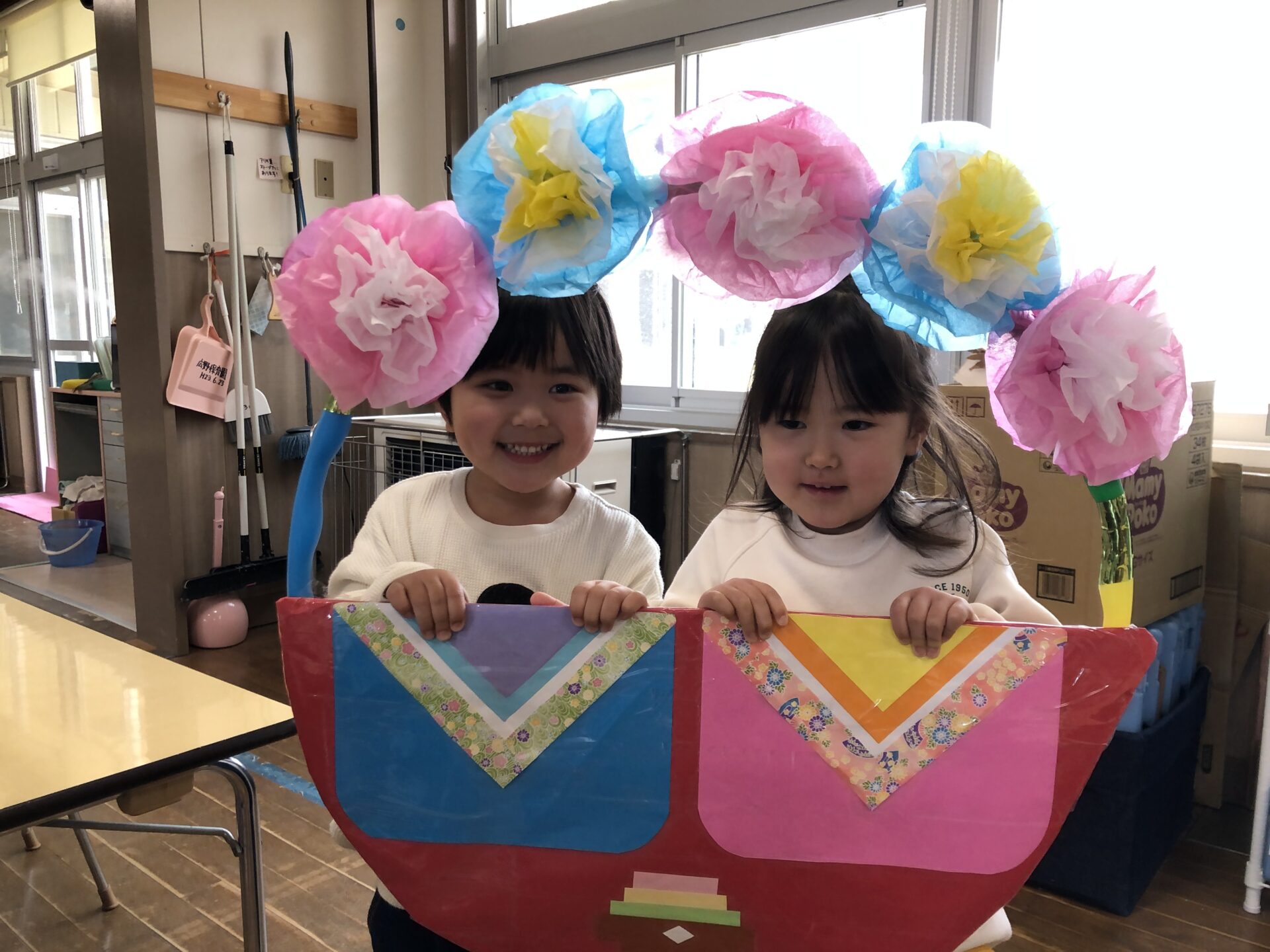 お雛様たちが帰った後は、各保育室や遊戯室で思い思いにコーナーでひなまつりの雰囲気を楽しみました。