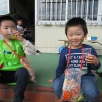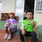 ゆり組さんとひまわり組さんはお菓子を袋がいっぱいになり我慢できず、お菓子休憩