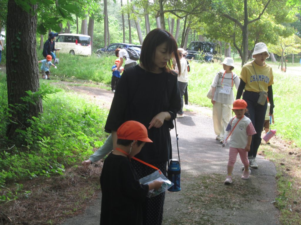 遊ぽっとに着くと、最初はネイチャーゲームをして親子で楽しみました。ビンゴカードに描かれたものを見つけるために、会話を楽しんだり、形のいいものを吟味したりと木々の木漏れ日の中、気持ちよく楽しんでいました。